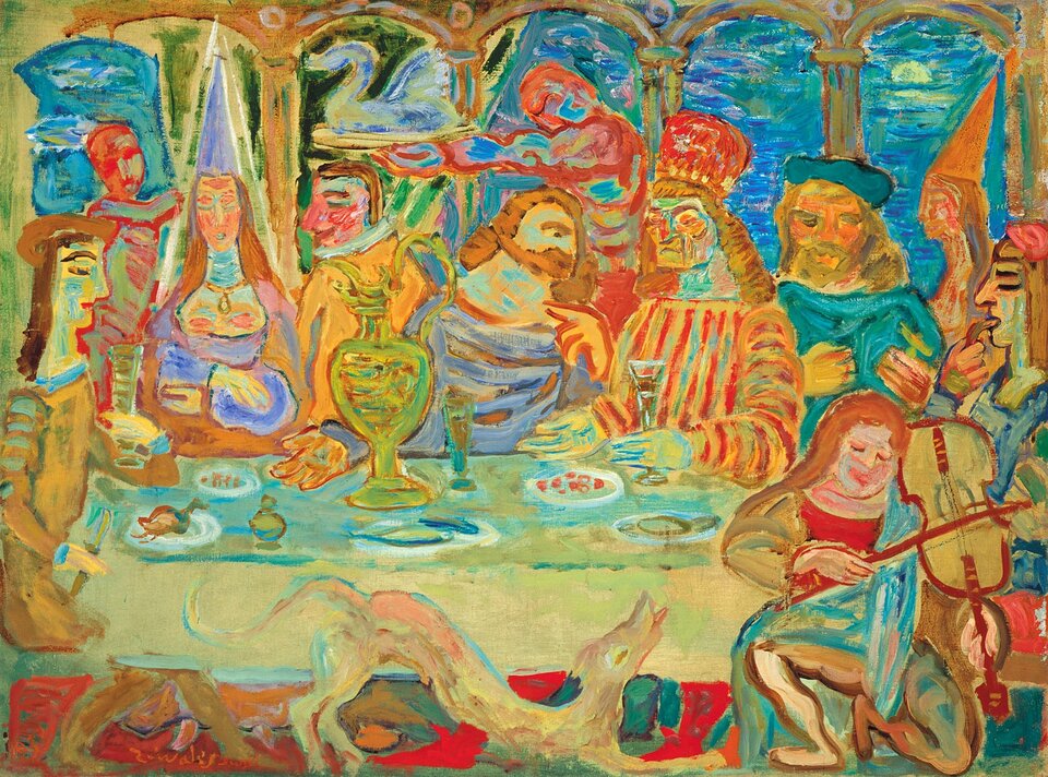 Najbardziej charakterystyczną kompozycją jest Uczta o pionowej kompozycji i dynamicznej scenie.