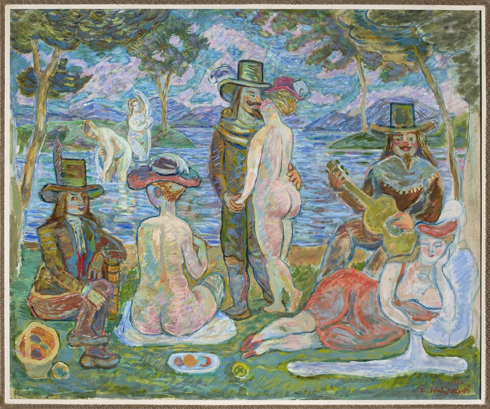 Tematyka obrazu – grupa osób odpoczywających i bawiących się w idyllicznym pejzażu – nawiązuje zarówno do „Koncertu wiejskiego” Tycjana, jak i skandalizującego „Śniadania na trawie” Édouarda Maneta. Z kolei sam tytuł dzieła odwołuje się do interpretacji słynnych obrazów Jean‑Antoine Watteau „Odjazd na Cyterę”. (...) Waliszewski czerpał z wielkich poprzedników, ale najważniejszą rolę odgrywał w jego obrazach kolor. Krajobraz o nasyconych barwach wypełnia światło.