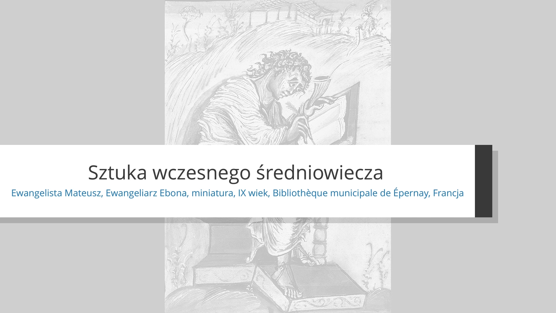 W 1 połowie IX wieku w skryptorium w Reims, pod patronatem arcybiskupa Ebbona powstał ewangeliarz, charakteryzujący się dynamicznymi, ekspresyjnymi miniaturami. Ewangeliarz Ebbona cechuje nasycenie barw, dynamiczny układ ciał, obecność bordiury, linearyzm, bogate plamy barwne, wyraźne kontury, miękko spływające szaty, proporcje, monumentalizm postaci oraz bogata symbolika.