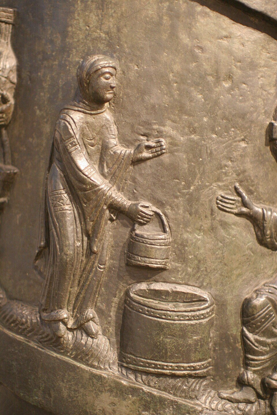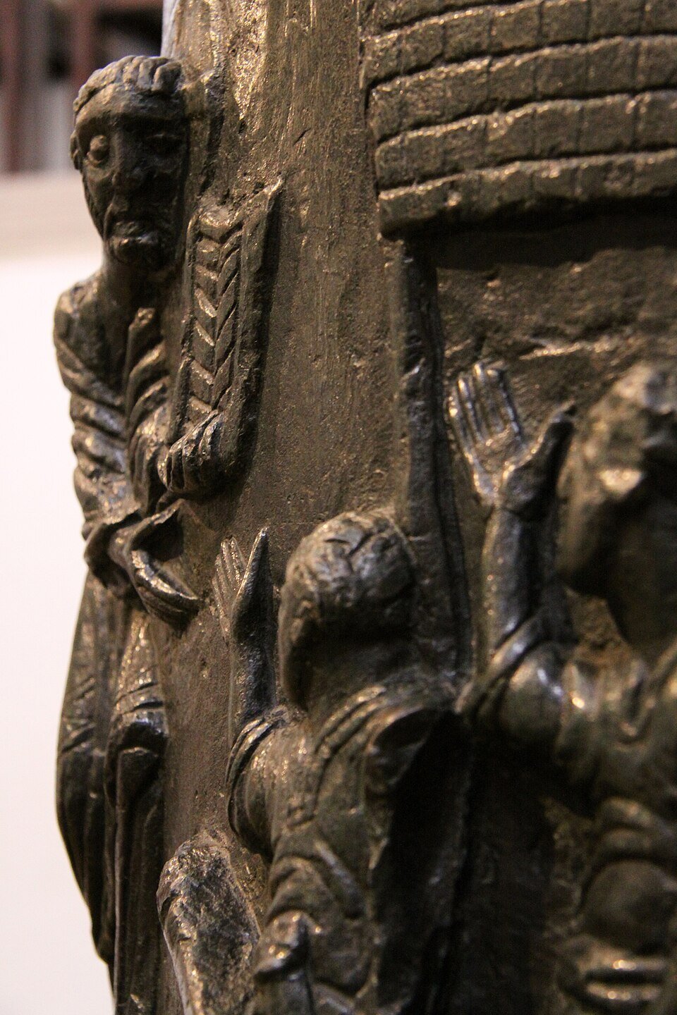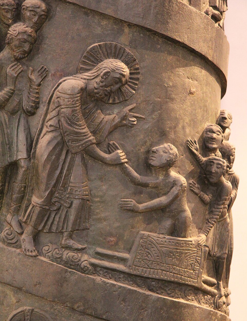 Trzon kolumny oplata spiralny fryz reliefowy przedstawiający ciągłą narrację z życia Chrystusa. Cykl rozpoczyna się przy podstawie sceną Chrztu w Jordanie, następnie ukazuje kolejne epizody ewangeliczne: cuda (m.in. wesele w Kanie, uzdrowienie trędowatego, wskrzeszenie Łazarza), sceny walki ze złem, wydarzenia o charakterze misyjnym (powołanie i rozesłanie apostołów, spotkanie z Samarytanką) oraz epizody związane z Janem Chrzcicielem. Narrację zamyka triumfalny wjazd Chrystusa do Jerozolimy, podkreślający teologiczny wymiar całego programu ikonograficznego.