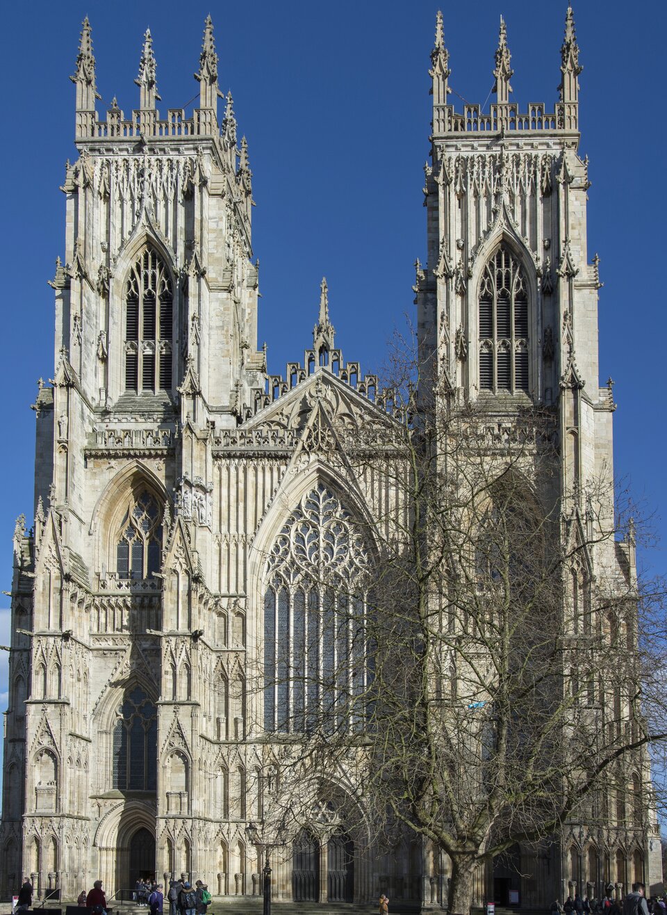 Wpływy francuskie zaznaczyły się również w katedrze w Yorku, której budowę rozpoczęto w połowie XIII wieku, a ukończono na przełomie XIV i XV wieku. Świątynia została założona na planie krzyża łacińskiego, z wyraźnie wyodrębnioną nawą główną, transeptem i prezbiterium. Układ obejmuje trzy nawy, z których nawa główna dominuje wysokością i szerokością nad bocznymi. Chór ma formę prostokątną, bez obejścia. Na skrzyżowaniu nawy głównej z transeptem wznosi się wieża centralna, stanowiąca pionową dominantę kompozycyjną i punkt kulminacyjny układu przestrzennego. Szerokość fasady zachodniej odpowiada szerokości całego korpusu nawowego, podkreślając symetrie układu. Wieże zachodnie, zakończone narożnymi wieżyczkami, w dolnych partiach zostały oskarpowane, co wzmacnia ich konstrukcję i nadaje elewacji wertykalny rytm. W środkowym portalu fasady umieszczono trójkątny przyczółek, zwieńczony galeryjką.