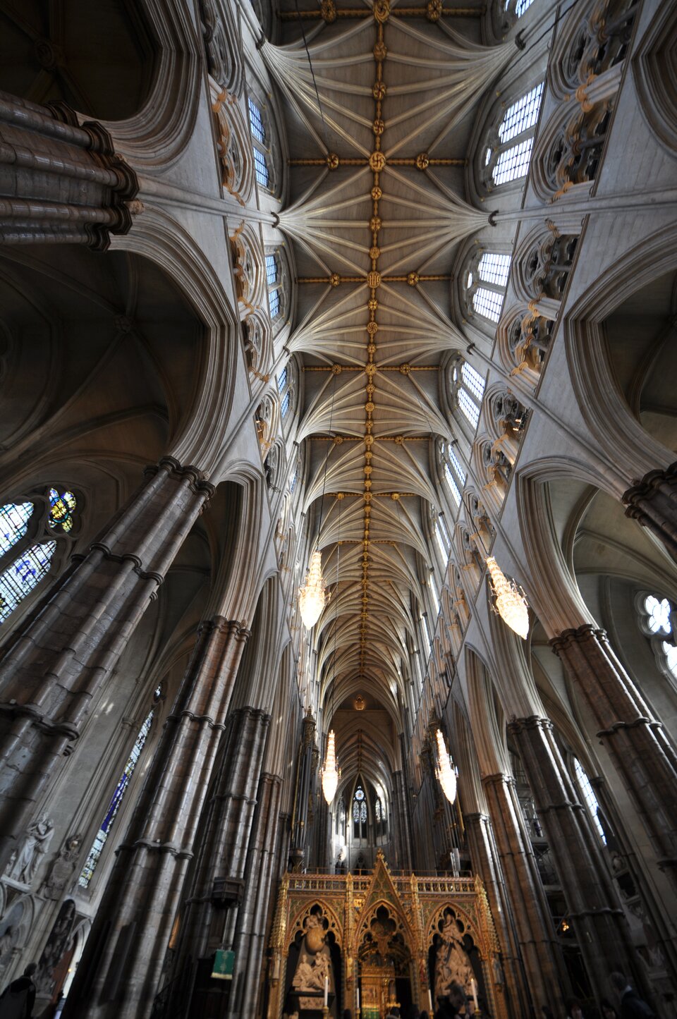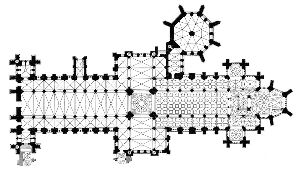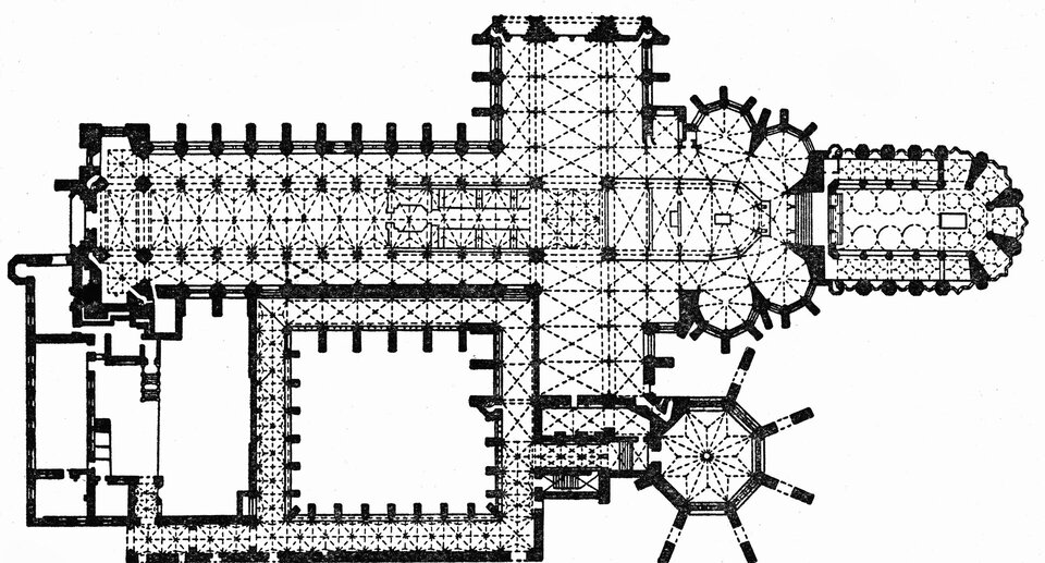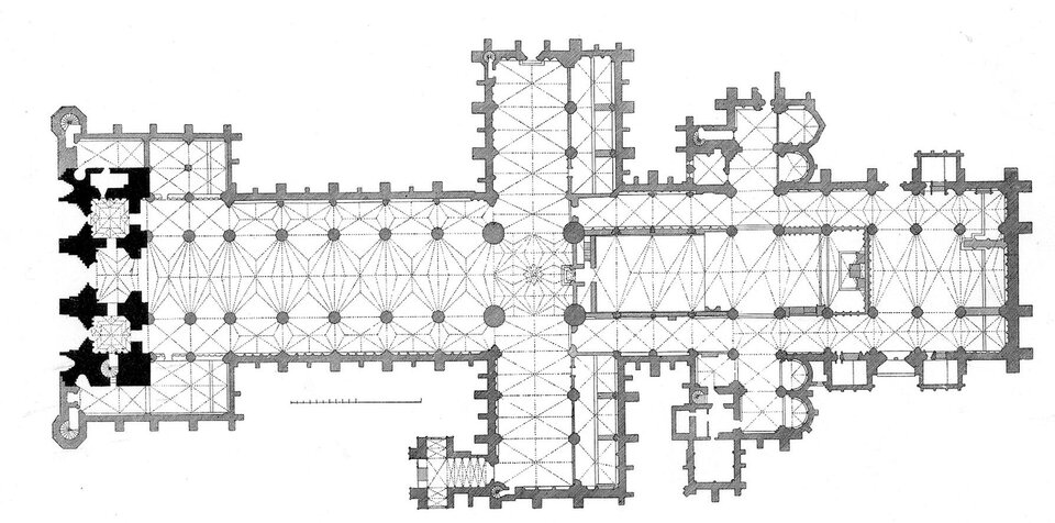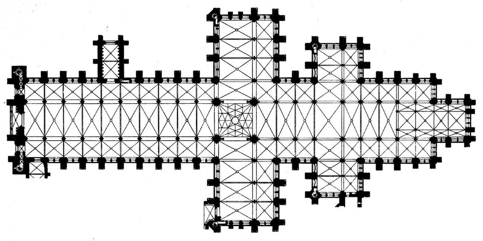 Jeszcze wyraźniejszy wpływ francuski zaznaczył się w londyńskim opactwie Westminster. Plan opactwa Westminster ma formę typowego krzyża łacińskiego, jednak z rozwiązaniami świadczącymi zarówno o inspiracjach francuskich, jak i o rodzimym, angielskim charakterze. Długi, trójnawowy korpus prowadzi do rozbudowanego transeptu, którego ramiona również są trójnawowe i mocno wysunięte poza obrys świątyni. Prezbiterium zostało przedłużone i zamknięte wielobocznie, a wokół niego poprowadzono obejście z promieniście rozmieszczonymi kaplicami, co wyraźnie nawiązuje do francuskich katedr. Całość uzupełnia zachodnia fasada z dwiema wieżami, które flankują wejście. Plan Westminsteru daje wrażenie monumentalności i harmonii – francuskie rozwiązania konstrukcyjne, takie jak obejście i kaplice, spotykają się tu z angielskim zamiłowaniem do wydłużonego korpusu, tworząc świątynię o wyjątkowym, syntezującym charakterze.