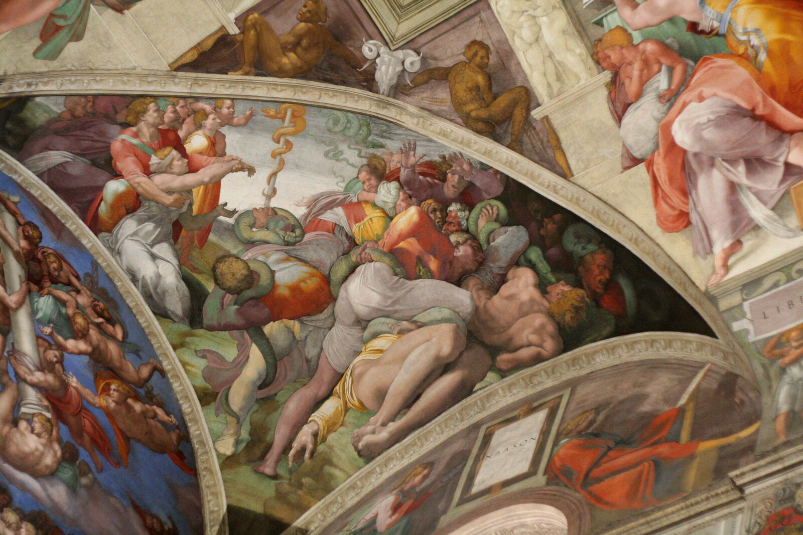 Michał Anioł Buonarroti [czytaj błonaroti] (Michelangelo di Lodovico Buonarroti Simoni) [czytaj: mikelandżelo di lodowiko błonaroti simoni] pomiędzy majem 1508 a październikiem 1512 roku namalował freskifreski na sklepieniusklepieniu Kaplicy Sykstyńskiej pałacu watykańskiego, zbudowanej na zamówienie papieża Sykstusa IV.