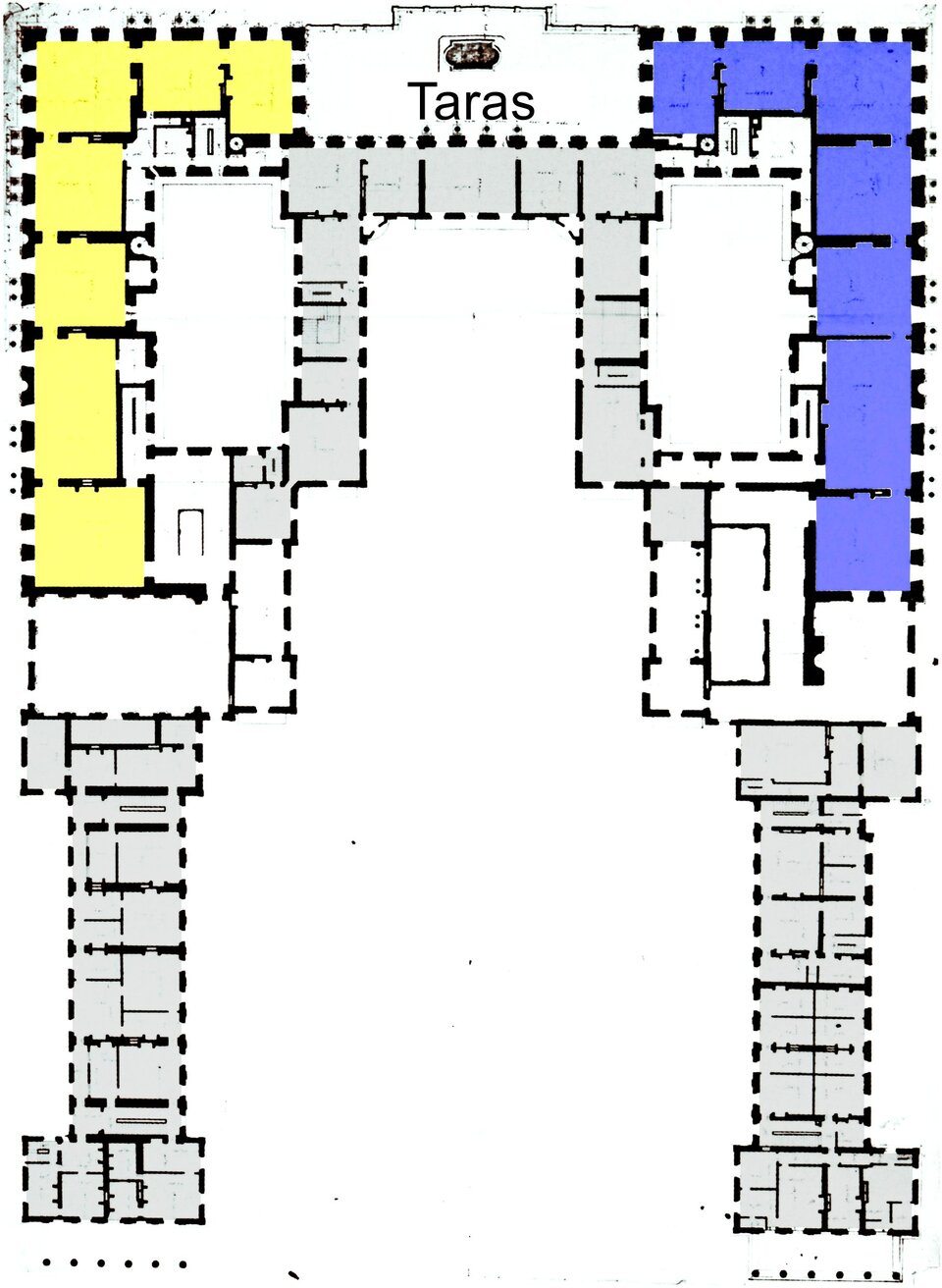 Fasada od strony dziedzińców, choć mniej eksponowana niż elewacja ogrodowa, stanowiła zasadniczy punkt odniesienia dla całego założenia pałacowego. W centralnej części korpusu głównego znajdowała się sypialnia królewska, pełniąca funkcję symbolicznego i ceremonialnego centrum rezydencji Ludwika XIV. Plan kondygnacji ujawnia wyraźnie osiowy układ przestrzenny, prowadzący od dziedzińców ku wnętrzu pałacu i podporządkowujący rozmieszczenie pomieszczeń funkcjom królewskim. Z kolei widok z lotu ptaka na Dziedziniec Marmurowy i Dziedziniec Królewski ukazuje uporządkowany układ stref wejściowych, które podkreślają monumentalny wymiar architektury i kierują uwagę ku centralnej części korpusu pałacowego.
