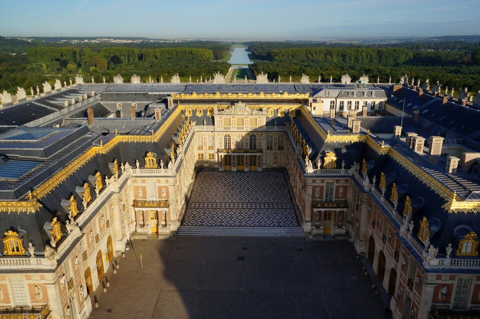 Ogrody: Widok z lotu ptaka na pałac w Wersalu i jego rozległe ogrody. Na pierwszym planie widać dziedziniec i baseny wodne przed pałacem, a dalej symetryczne partery ogrodowe, alejki oraz długi kanał ciągnący się w głąb krajobrazu. Całość otaczają rozległe tereny zielone i lasy.