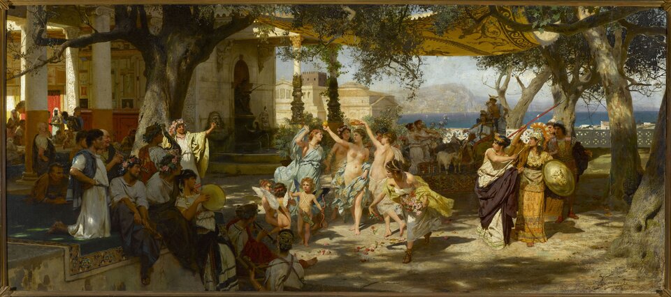 Henryk Siemiradzki to najwybitniejszy przedstawiciel europejskiego malarstwa akademickiego drugiej połowy XIX wieku, artysta o ugruntowanej, międzynarodowej pozycji. Siemiradzki przez całe życie czuł się Polakiem, choć prasa przypisywała mu rosyjską narodowość Jego rozwój artystyczny miał charakter wieloetapowy - od studiów przyrodniczych po klasyczne wykształcenie akademickie, które ukształtowało jego warsztat i estetyczne wybory. Dzięki temu w jego twórczości łączyły się precyzja obserwacji, erudycja historyczna oraz doskonałe opanowanie techniki malarskiej. Doświadczenia zdobywane w różnych ośrodkach artystycznych Europy pozwoliły mu nawiązać kontakty z międzynarodowym środowiskiem twórców i krytyków. Szczególnie istotne było dla niego zetknięcie się z tradycją malarstwa historycznego oraz akademickiego, które stało się fundamentem jego dojrzałego stylu. Ostatecznie centrum jego działalności twórczej stał się Rzym, miasto antyku i klasycznej harmonii, które idealnie odpowiadało jego zainteresowaniom tematyką starożytną. Siemiradzki zasłynął przede wszystkim jako autor monumentalnych, wielopostaciowych scen inspirowanych światem antycznym. Kompozycje te miały charakter widowiskowy i teatralny, były starannie zaplanowane pod względem układu postaci, perspektywy i światła. Artysta dążył do iluzjonistycznej perfekcji, wykorzystując bogactwo detalu, wyrafinowaną kolorystykę oraz doskonałą znajomość anatomii i architektury.