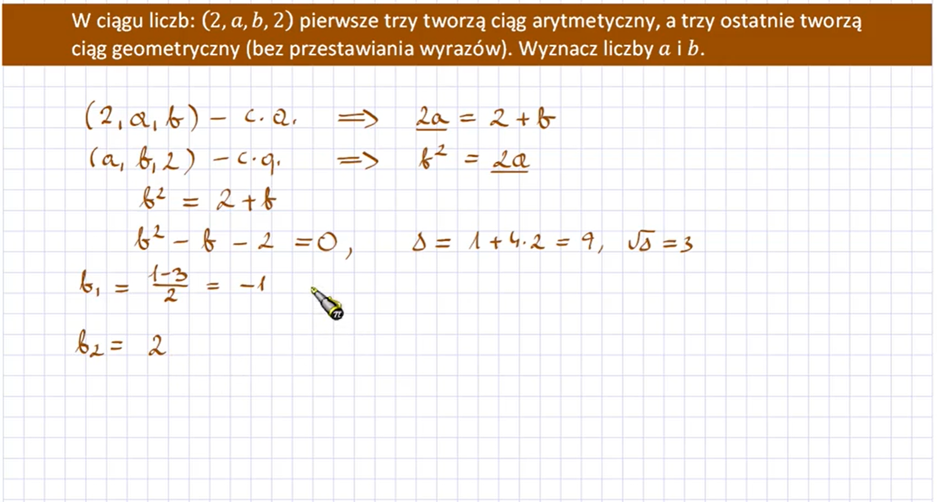 Dane są liczby , , , . Trzy pierwsze (w podanej kolejności) tworzą ciąg arytmetycznyciąg arytmetyczny, a trzy ostatnie (w podanej kolejności) tworzą ciąg geometryczny. Znajdziemy liczby , .