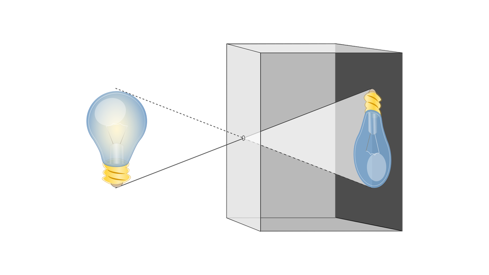 Promień wychodzący z górnej części żarówki biegnie po linii prostej do otworka w pudełku. Wpada przez otwór do środka i trafia na ekran, tworząc obraz górnej części żarówki na dolnej części ekranu. Podobnie promień wychodzący z dolnej części żarówki biegnie do otworka pudełka i dalej, ku górnej części ekranu. W ten sposób powstaje odwrócony obraz żarówki lub innych przedmiotów.