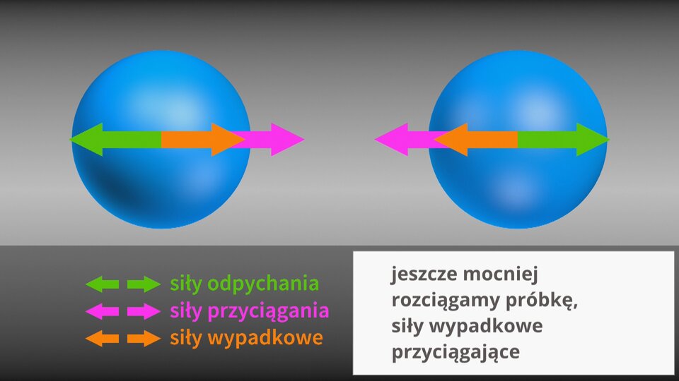 Odkształcony pręt sprężysty też ma energię, ponieważ jest zdolny wykonać pracę. Ten rodzaj energii nazywamy energią potencjalną sprężystościenergia potencjalna sprężystościenergią potencjalną sprężystości. Skoro jest to energia potencjalna, powinna zależeć od wzajemnego położenia ciał, które się przyciągają lub odpychają. W tym przypadku chodzi o oddziaływanie cząsteczek bądź atomów, z których zbudowana jest nasza sprężyna. Gdy zmieniamy kształt sprężyny, zmianie ulegają odległości między cząsteczkami lub atomami tworzącymi sprężynę. Jak to się dzieje, pokazano na animacji zamieszczonej poniżej.