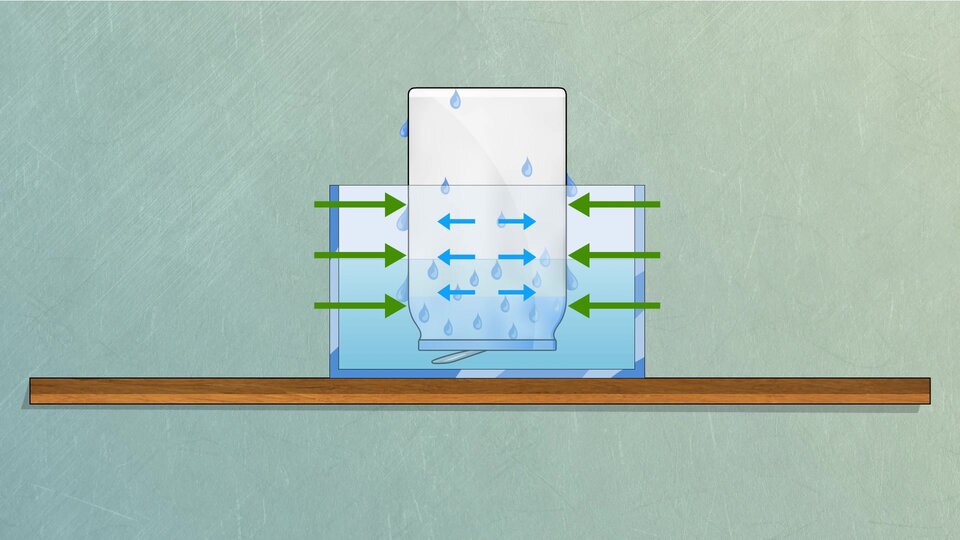 Zasięg strumienia wody wypływającego przez otwór znajdujący się najbliżej dna butelki jest największy, a strumienia wypływającego przez najwyższy otwór – najmniejszy. Oznacza to, że ciśnienie na dnie naczynia jest znacznie większe od ciśnienia wody w pobliżu jej powierzchni.