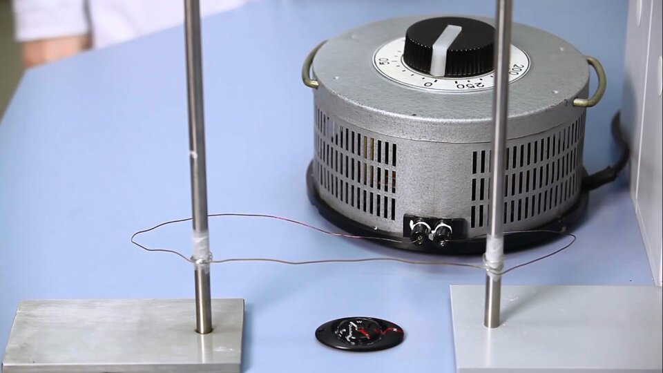 Film dotyczący oddziaływania na odległość przewodnika z prądem na igłę magnetyczną.