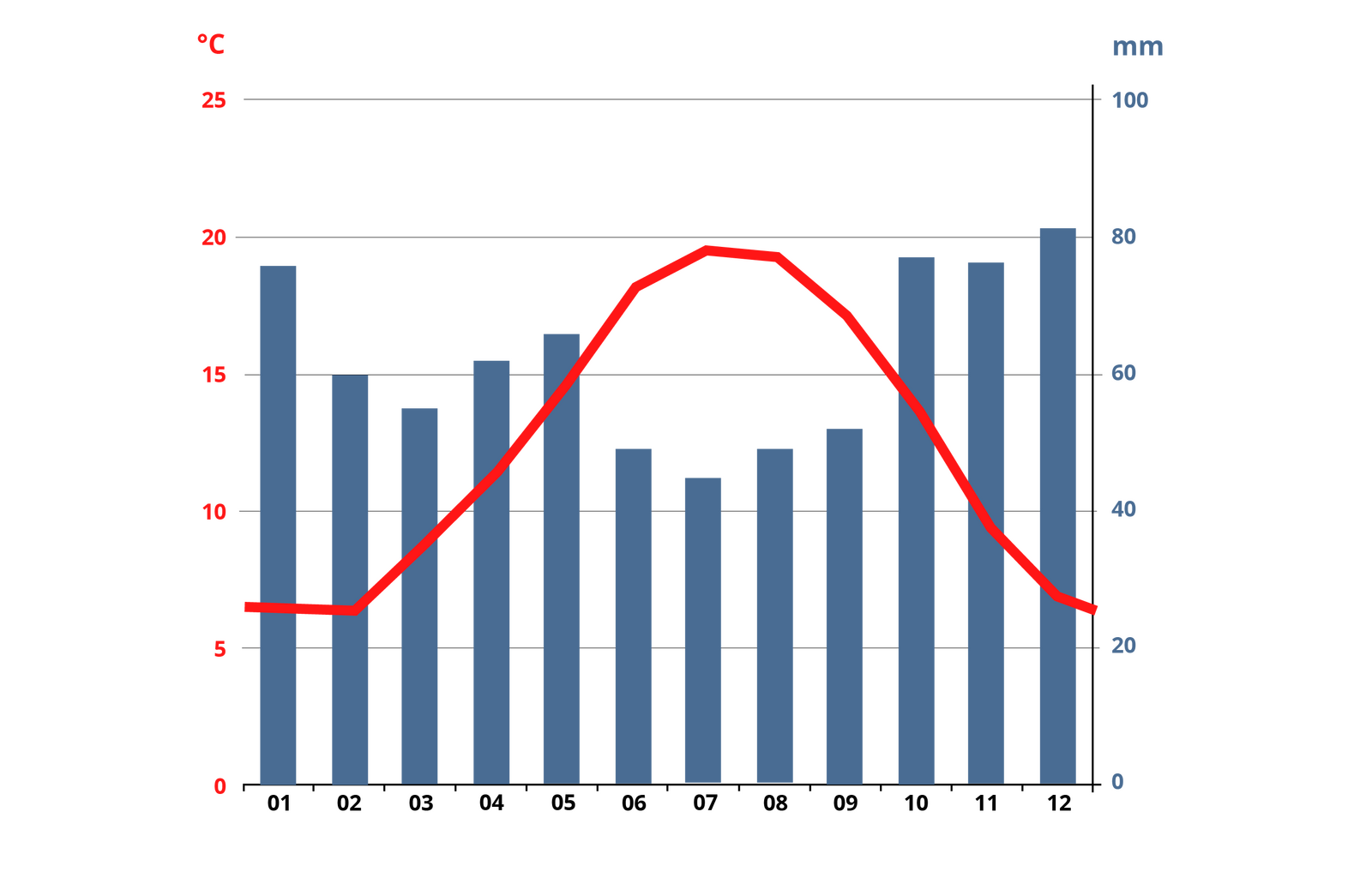 Natomiast na półkuli południowej średnia roczna temperatura powietrza nie spada poniżej 0Indeks górny oC, zimą wynosi od 5°C do 8°C a latem od 10°C do 18°C, dlatego rosną tam wiecznie zielone lasy, których drzewa nie gubią liści. W tym rejonie występują też większe niż na półkuli północnej opady, o rocznej sumie 1 200—3 000 mm, często pojawiają się też cyklony. Poniżej zamieszczono klimatogramy prezentujące zmienność cech klimatu w wybranych miejscach strefy lasów liściastych i mieszanych na półkuli północnej i południowej.