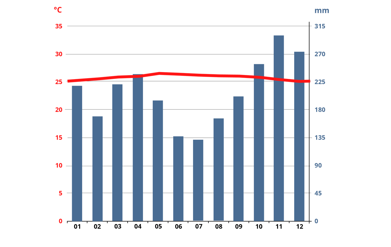 W Manaus, brazylijskim mieście, które leży nad Amazonką, temperatury powietrza w lesie równikowym przez cały rok wahają się w granicach około 25–30 °C, a opady deszczu są wysokie w każdym miesiącu