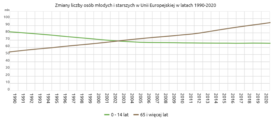 Wykres liniowy przedstawiający zmiany liczby osób młodych i starszych w Unii Europejskiej w latach 1990‑2020. Zieloną linią oznaczono zmiany liczby osób do czternastego roku życia, brązową linią osoby mające sześćdziesiąt pięć lat lub więcej. Na poziomej osi oznaczono lata, na pionowej liczbę osób w milionach, co pięć, od pięćdziesięciu pięciu do dziewięćdziesięciu pięciu. Na początku przedstawionego okresu liczba osób w starszych wynosiła niecałe pięćdziesiąt siedem milionów. Następnie wartość ta nieustannie rosła, do poziomu około dziewięćdziesięciu trzech milionów w roku dwa tysiące dwudziestym. Na początku przedstawionego okresu liczba osób młodych wynosiła niespełna osiemdziesiąt dwa miliony. Następnie wartość ta spadała, zrównując się na przełomie dwa tysiące drugiego i dwa tysiące trzeciego roku z liczbą osób starszych, osiągając wtedy wartość około siedemdziesięciu milionów. W dalszych latach liczba osób młodych zmniejszyła się do poziomu około sześćdziesięciu ośmiu milionów w roku dwa tysiące dziesiątym. W kolejnych latach wartość ta utrzymywała się na podobnym poziomie, w dwa tysiące dwudziestym osiągając wartość około sześćdziesięciu siedmiu i pół miliona.