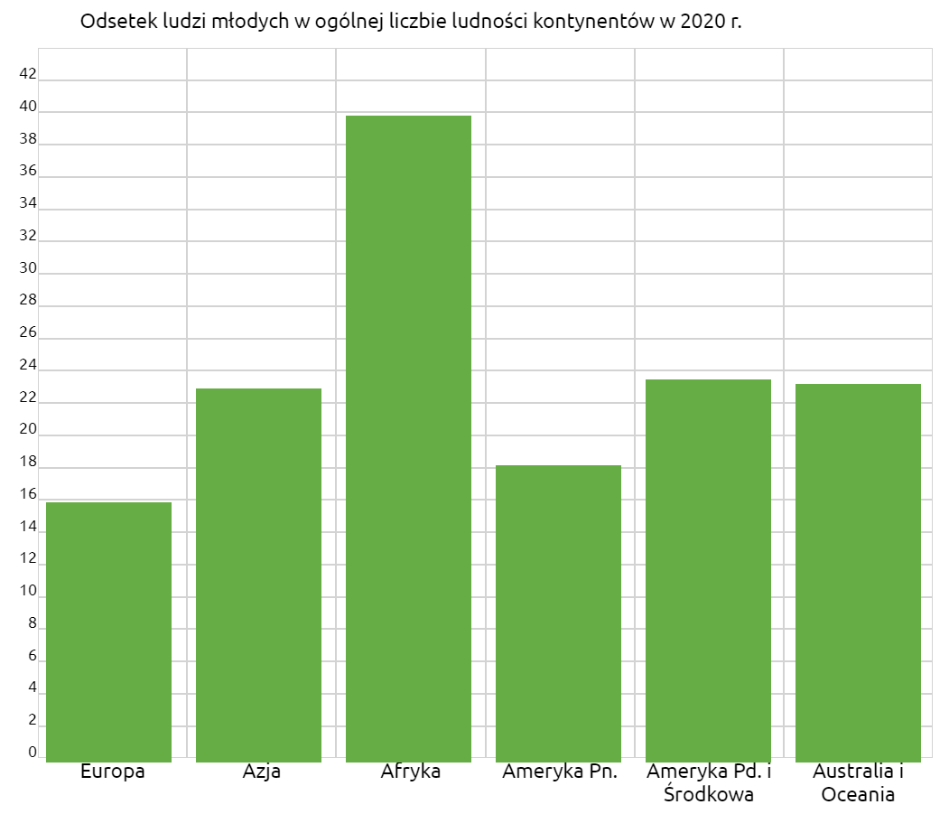 Odsetek ludzi młodych w ogólnej liczbie ludności kontynentów w 2020 r.