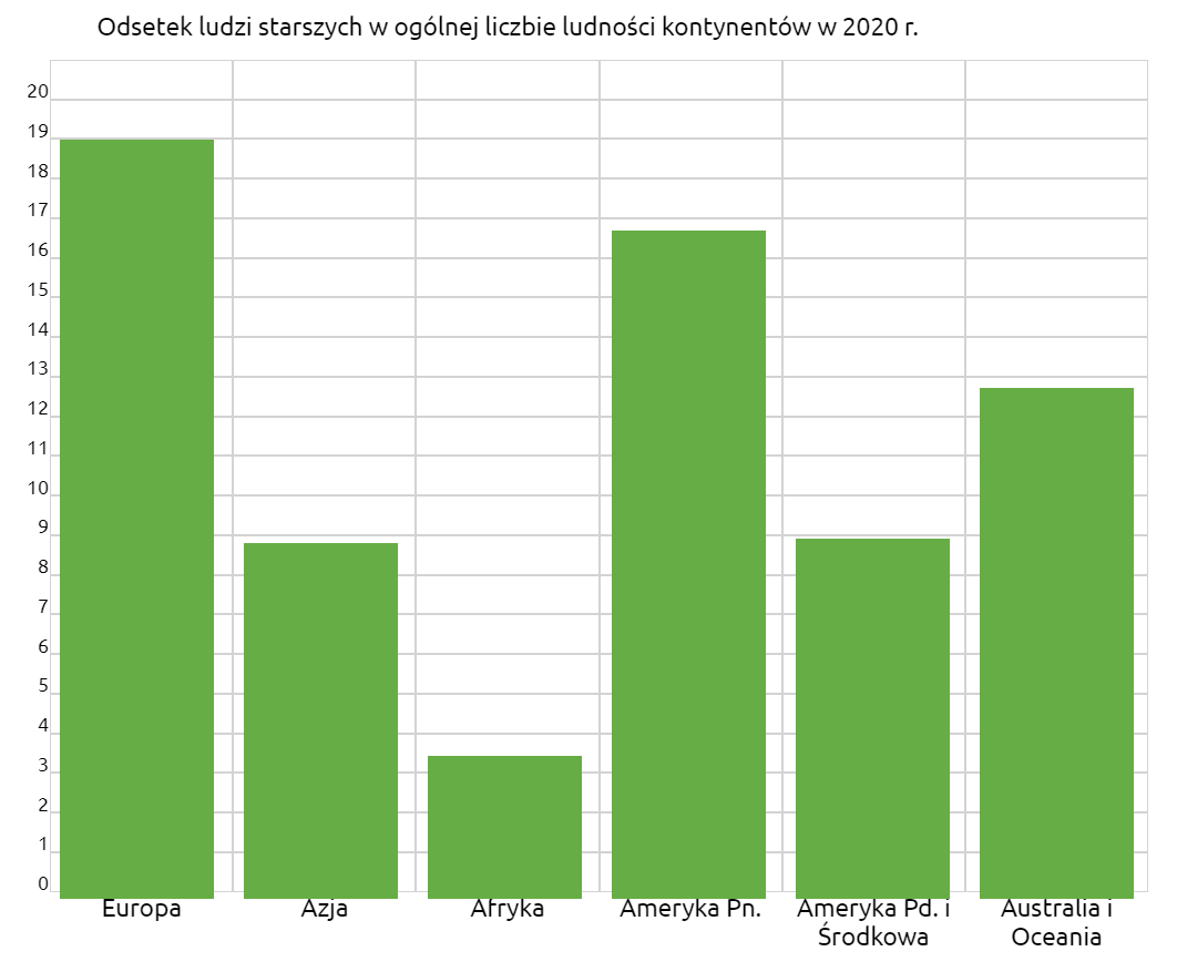 Treść nagrania: Najwyższy odsetek osób starszych w ogólnej liczbie ludności w 2020 roku występuje w Europie, najniższy natomiast w Afryce.
