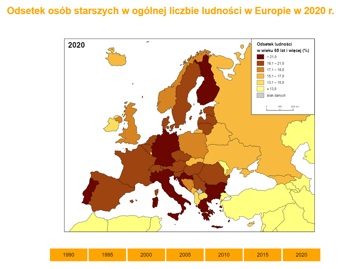 Interaktywny komponent składający się z siedmiu map przedstawiających odsetek osób starszych w ogólnej liczbie ludności w Europie w roku tysiąc dziewięćset dziewięćdziesiątym, dziewięćdziesiątym piątym, dwutysięcznym, dwa tysiące piątym, dwa tysiące dziesiątym, dwa tysiące piętnastym i dwa tysiące dwudziestym. Mapa Europy prezentująca odsetek ludności w wieku sześćdziesięciu pięciu i więcej lat w tysiąc dziewięćset dziewięćdziesiątym roku.Kraje, w których odsetek wynosi trzynaście procent lub mniej: Rosja, Polska, Litwa, Łotwa, Estonia, Białoruś, Ukraina, Mołdawia, Rumunia, Czechy, Słowacja, Słowenia, Chorwacja, Serbia, Czarnogóra, Bośnia i Hercegowina, Albania, Macedonia Północna, Turcja, Holandia, Irlandia, Islandia.Kraje, w których odsetek wynosi od trzynastu i jednej dziesiątej do piętnastu procent: Portugalia, Hiszpania, Francja, Włochy, Szwajcaria, Niemcy, Austria, Węgry, Bułgaria, Grecja.Kraje, w których odsetek wynosi od piętnastu i jednej dziesiątej do siedemnastu procent: Wielka Brytania, Dania, Norwegia.Kraje, w których odsetek wynosi od siedemnastu i jednej dziesiątej do dziewiętnastu procent: Szwecja.Kosowo – brak danych.Mapa Europy prezentująca odsetek ludności w wieku sześćdziesięciu pięciu i więcej lat w tysiąc dziewięćset dziewięćdziesiątym piątym roku.Kraje, w których odsetek wynosi trzynaście procent lub mniej: Rosja, Polska, Litwa, Białoruś, Słowacja, Mołdawia, Rumunia, Serbia, Słowenia, Bośnia i Hercegowina, Czarnogóra, Albania, Macedonia Północna, Turcja, Irlandia, Islandia.Kraje, w których odsetek wynosi od trzynastu i jednej dziesiątej do piętnastu procent: Łotwa, Estonia, Finlandia, Ukraina, Czechy, Holandia, Luksemburg, Szwajcaria, Węgry, Chorwacja, Grecja.Kraje, w których odsetek wynosi od piętnastu i jednej dziesiątej do siedemnastu procent: Wielka Brytania, Norwegia, Dania, Niemcy, Belgia, Francja, Portugalia, Hiszpania, Włochy, Austria, Bułgaria.Kraje, w których odsetek wynosi od siedemnastu i jednej dziesiątej do dziewiętnastu procent: Szwecja.Kosowo – brak danych.Mapa Europy prezentująca odsetek ludności w wieku sześćdziesięciu pięciu i więcej lat w dwutysięcznym roku.Kraje, w których odsetek wynosi trzynaście procent lub mniej: Rosja, Polska, Słowacja, Irlandia, Islandia, Mołdawia, Bośnia i Hercegowina, Czarnogóra, Albania, Macedonia Północna, Turcja.Kraje, w których odsetek wynosi od trzynastu i jednej dziesiątej do piętnastu procent: Litwa, Łotwa, Białoruś, Ukraina, Rumunia, Serbia, Słowenia, Czechy, Holandia, Luksemburg, Dania.Kraje, w których odsetek wynosi od piętnastu i jednej dziesiątej do siedemnastu procent: Estonia, Norwegia, Wielka Brytania, Portugalia, Hiszpania, Francja, Belgia, Niemcy, Szwajcaria, Austria, Węgry, Słowenia, Bułgaria, Grecja.Kraje, w których odsetek wynosi od siedemnastu i jednej dziesiątej do dziewiętnastu procent: Włochy, Szwecja.Kosowo – brak danych.Mapa Europy prezentująca odsetek ludności w wieku sześćdziesięciu pięciu i więcej lat w dwa tysiące piątym roku.Kraje, w których odsetek wynosi trzynaście procent lub mniej: Islandia, Irlandia, Słowacja, Mołdawia, Albania, Macedonia Północna, Turcja.Kraje, w których odsetek wynosi od trzynastu i jednej dziesiątej do piętnastu procent: Rosja, Białoruś, Polska, Czechy, Holandia, Luksemburg, Norwegia, Bośnia i Hercegowina, Serbia, Czarnogóra.Kraje, w których odsetek wynosi od piętnastu i jednej dziesiątej do siedemnastu procent: Litwa, Łotwa, Estonia, Finlandia, Dania, Wielka Brytania, Francja, Hiszpania, Szwajcaria, Austria, Węgry, Słowenia, Rumunia, Ukraina.Kraje, w których odsetek wynosi od siedemnastu i jednej dziesiątej do dziewiętnastu procent: Niemcy, Belgia, Portugalia, Szwecja, Chorwacja, Bułgaria, Grecja.Kraje, w których odsetek wynosi od dziewiętnastu i jednej dziesiątej do dwudziestu jeden procent: Włochy.Kosowo – brak danych.Mapa Europy prezentująca odsetek ludności w wieku sześćdziesięciu pięciu i więcej lat w dwa tysiące dziesiątym roku.Kraje, w których odsetek wynosi trzynaście procent lub mniej: Mołdawia, Słowacja, Turcja, Macedonia Północna, Albania, Czarnogóra, Irlandia, Islandia.Kraje, w których odsetek wynosi od trzynastu i jednej dziesiątej do piętnastu procent: Norwegia, Rosja, Białoruś, Polska, Bośnia i Hercegowina, Serbia.Kraje, w których odsetek wynosi od piętnastu i jednej dziesiątej do siedemnastu procent: Wielka Brytania, Francja, Holandia, Dania, Ukraina, Rumunia, Węgry, Serbia, Czechy.Kraje, w których odsetek wynosi od siedemnastu i jednej dziesiątej do dziewiętnastu procent: Portugalia, Hiszpania, Belgia, Austria, Chorwacja, Litwa, Łotwa, Estonia, Finlandia, Szwecja, Bułgaria.Kraje, w których odsetek wynosi od dziewiętnastu i jednej dziesiątej do dwudziestu jeden procent: Niemcy, Włochy, Grecja.Kosowo – brak danych.Mapa Europy prezentująca odsetek ludności w wieku sześćdziesięciu pięciu i więcej lat w dwa tysiące piętnastym roku.Kraje, w których odsetek wynosi trzynaście procent lub mniej: Mołdawia, Macedonia Północna, Albania, Turcja, Irlandia.Kraje, w których odsetek wynosi od trzynastu i jednej dziesiątej do piętnastu procent: Rosja, Białoruś, Słowacja, Islandia, Czarnogóra, Bośnia i Hercegowina.Kraje, w których odsetek wynosi od piętnastu i jednej dziesiątej do siedemnastu procent: Polska, Norwegia, Ukraina, Rumunia, Serbia.Kraje, w których odsetek wynosi od siedemnastu i jednej dziesiątej do dziewiętnastu procent: Wielka Brytania, Belgia, Holandia, Francja, Hiszpania, Szwajcaria, Austria, Czechy, Węgry, Słowenia, Litwa, Estonia.Kraje, w których odsetek wynosi od dziewiętnastu i jednej dziesiątej do dwudziestu jeden procent: Szwecja, Finlandia, Łotwa, Portugalia, Dania, Chorwacja, Bułgaria, Grecja.Kraje, w których odsetek wy