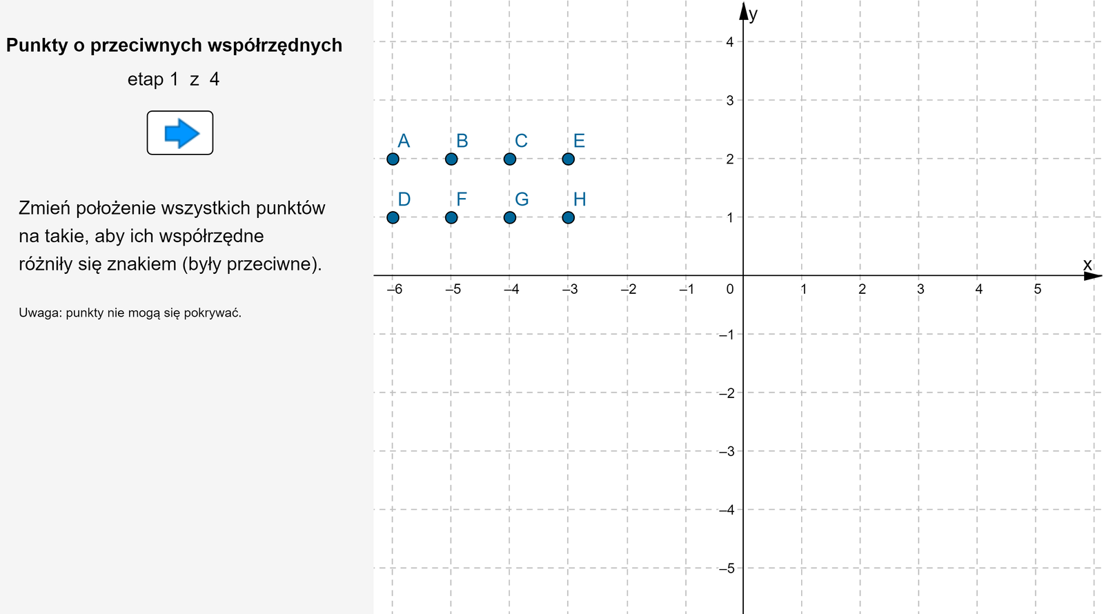 Wypisz punkty, których suma współrzędnych jest liczbą. nieujemną Możliwe odpowiedzi: 1. , 2. niedodatnią Możliwe odpowiedzi: 1. , 2.