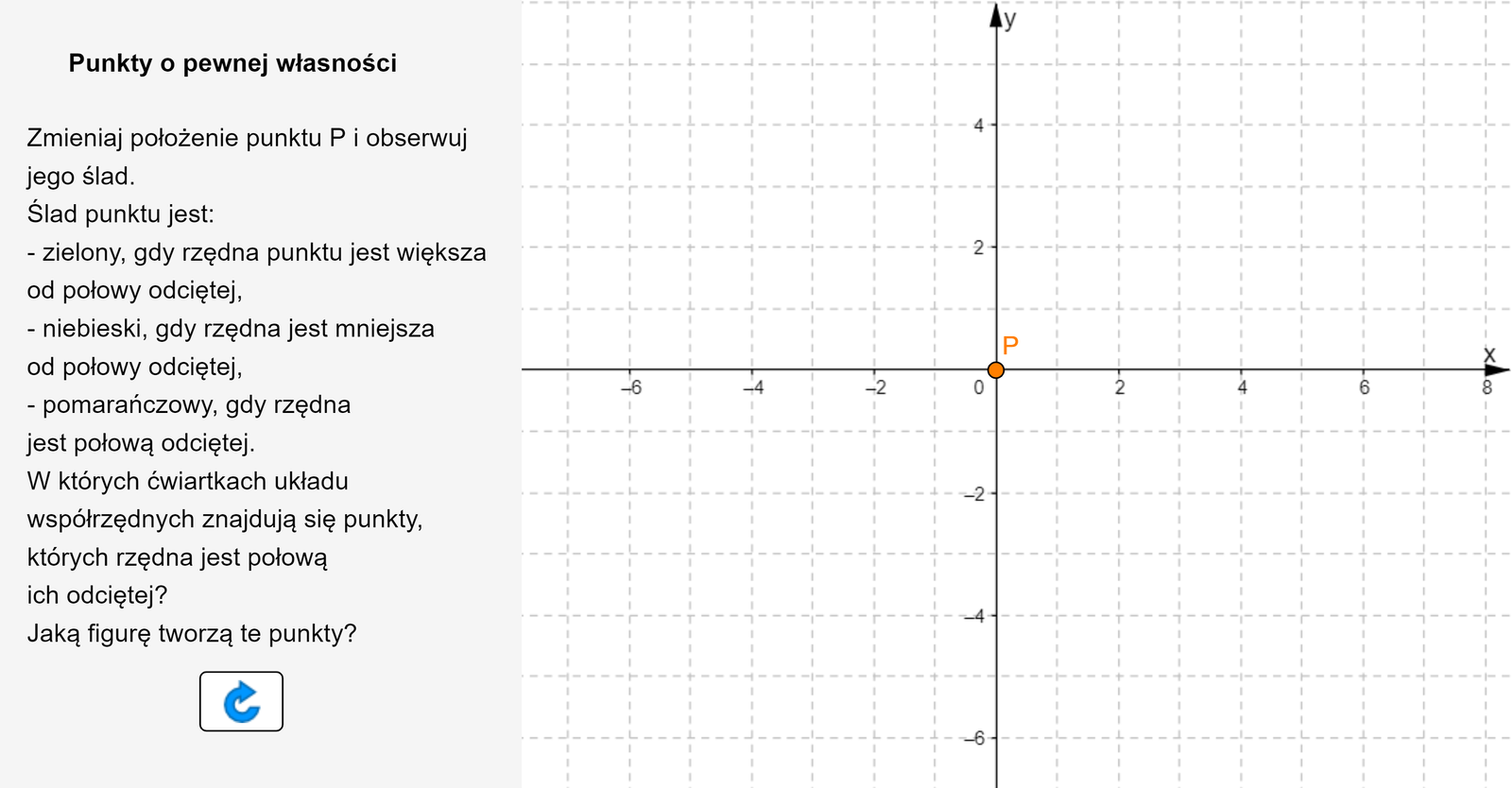 Znajdź takie punkty, których suma współrzędnych jest równa 0. Podaj przykład siedmiu takich punktów. Jaka jest zależność między pierwszą a drugą współrzędną każdego z punktów?