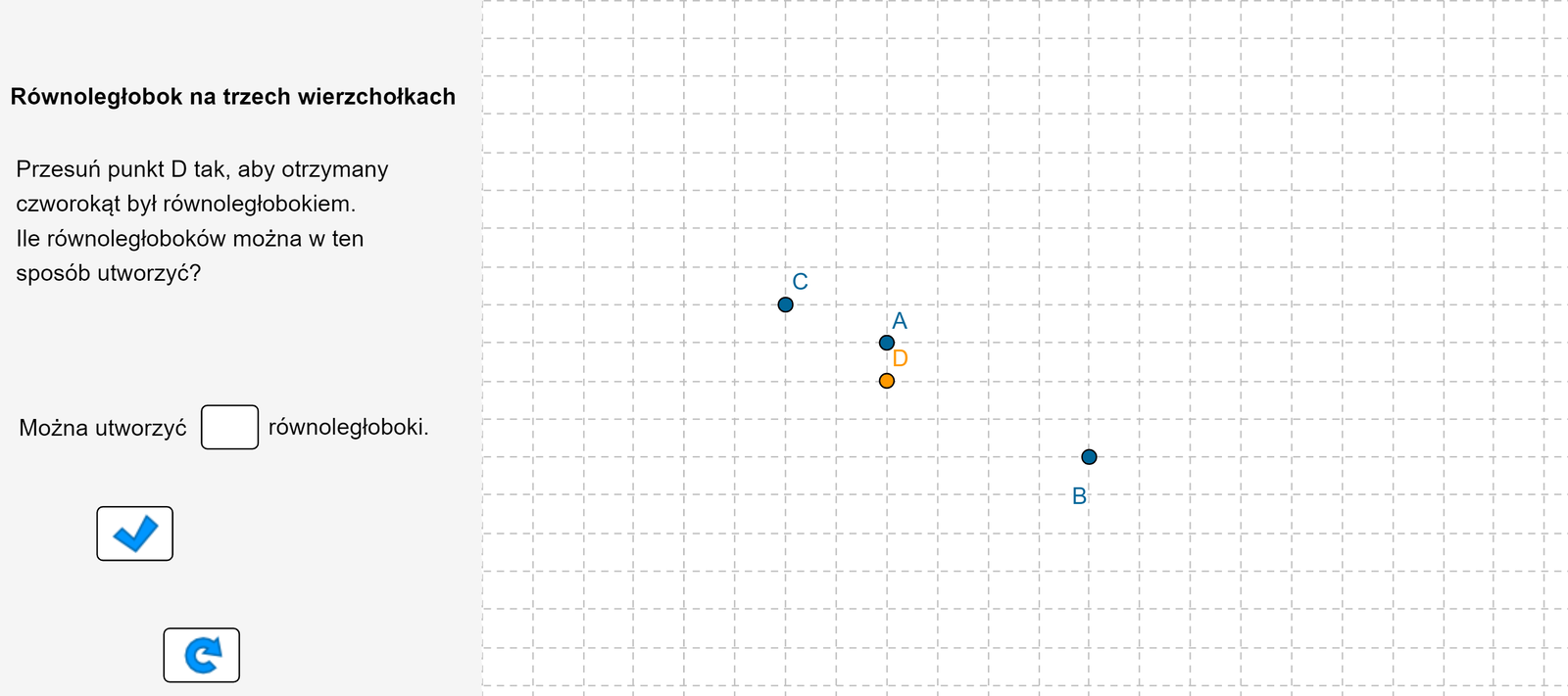 Punkty , i są trzema wierzchołkami równoległoboku. Umieść punkt tak, aby zbudować równoległobok .