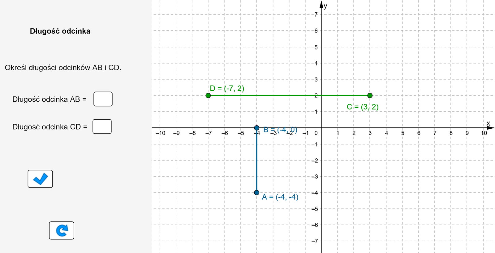 W przypadku, gdy odcinek leży w układzie współrzędnych na jednej z osi liczbowych, jego długość jest równa odległości punktów i .