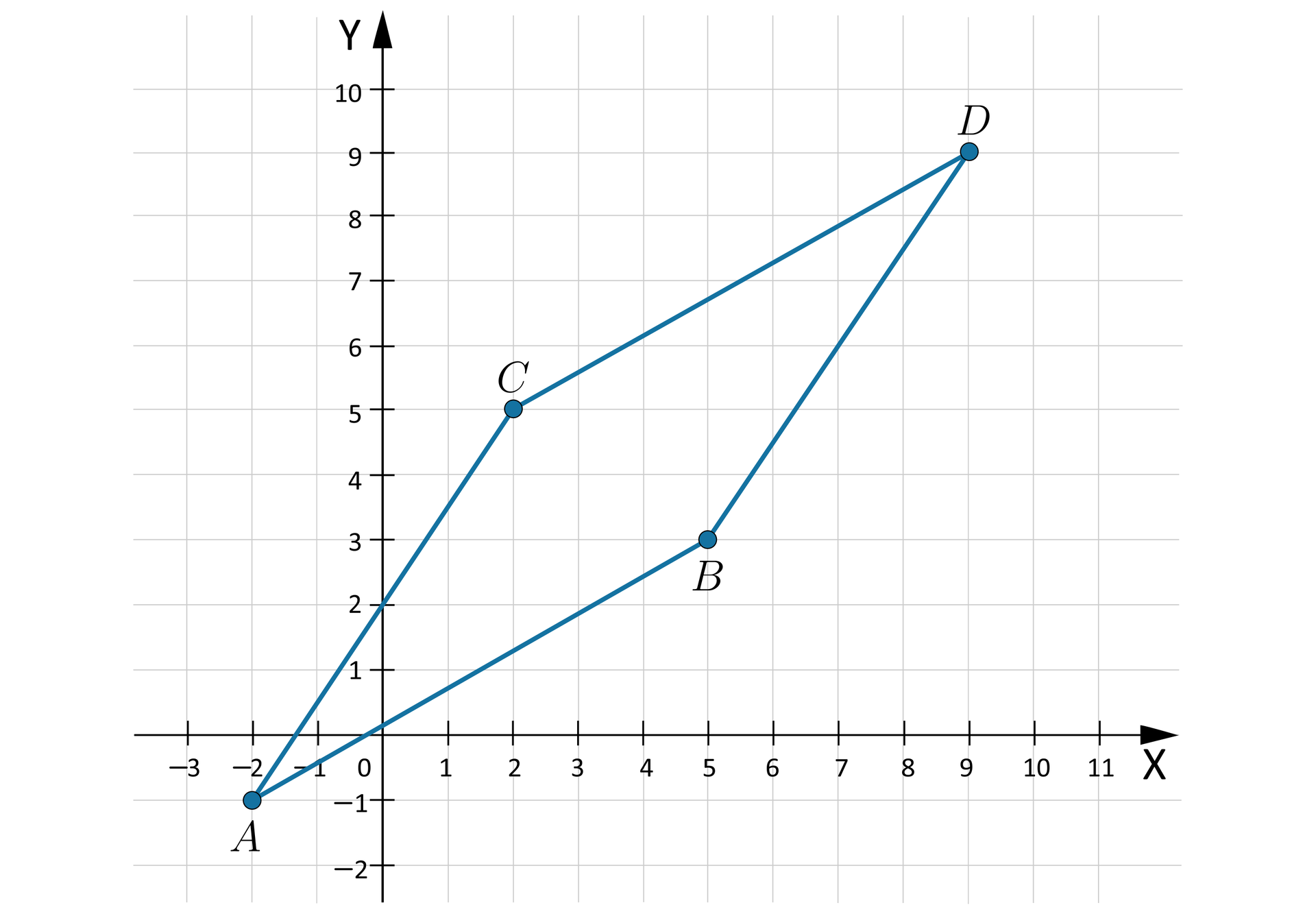 W układzie współrzędnych dane są punkty: , , . Znajdziemy taki punkt , aby wielokąt był równoległobokiem.