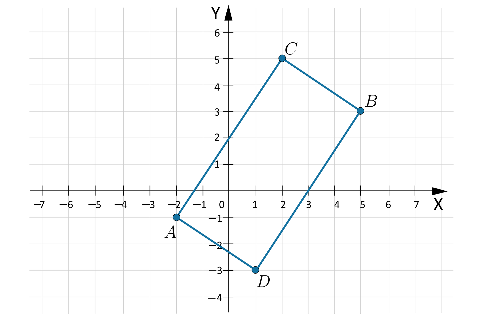 Zaznacz w układzie współrzędnych podane punkty: , , oraz taki punkt , aby otrzymany czworokąt był