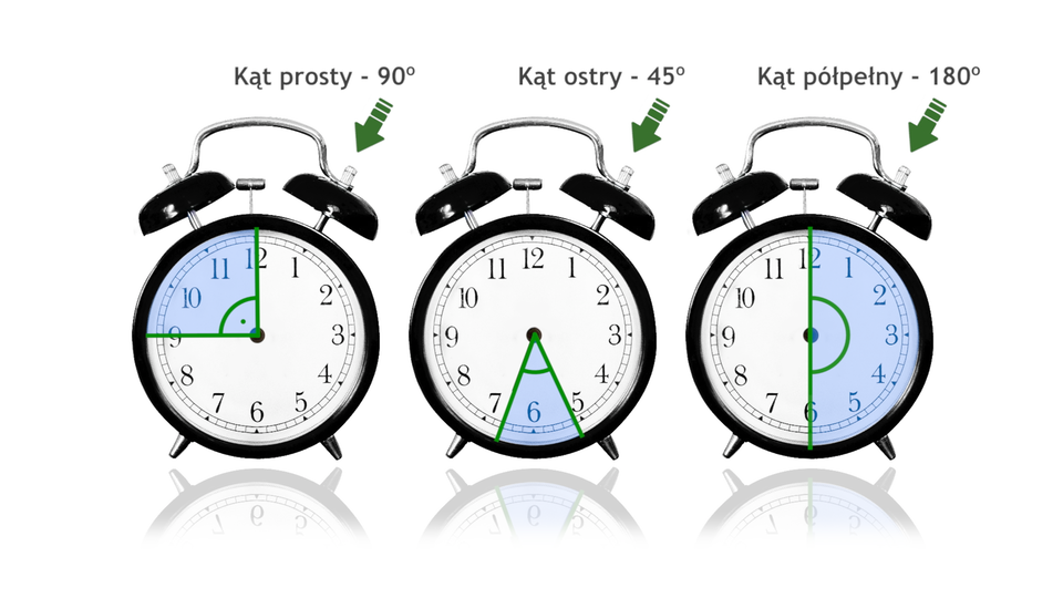 Animacja przedstawia różne rodzaje kątów na podstawie wskazówek zegara.