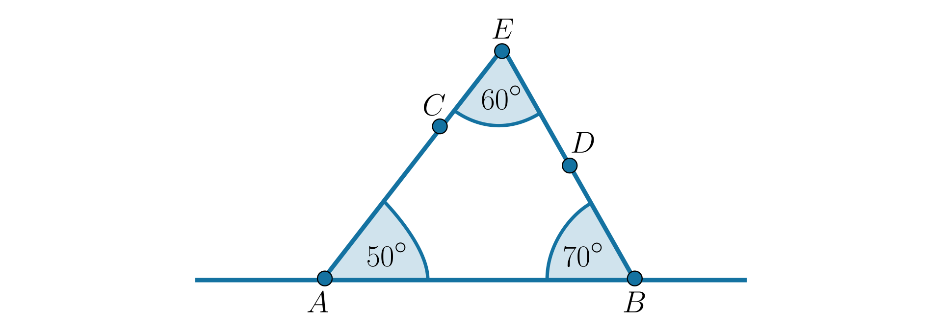 Narysuj prostą i zaznacz na niej dwa punkty AB. Narysuj kąt BAC o mierze 50°, a następnie kąt ABD, który ma 70°. Oba kąty powinny leżeć po tej samej stronie prostej AB. Oznacz punkt przecięcia ramion ACBD obu kątów literą E. Zmierz kąt AEB w powstałym trójkącie.