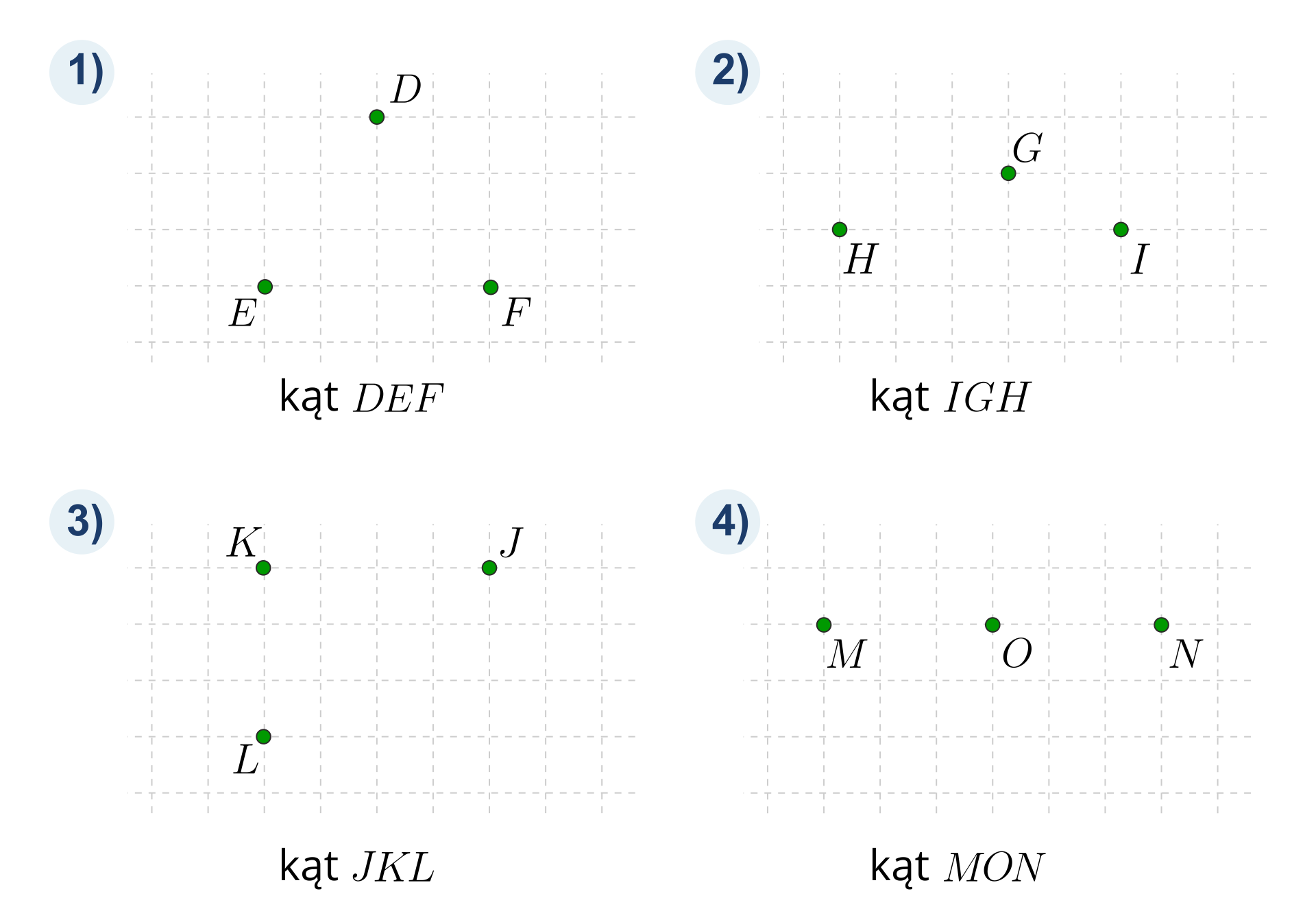 kąt DEF Możliwe odpowiedzi: 1. 180°, 2. 56°, 3. 90°, 4. 121° kąt IGH Możliwe odpowiedzi: 1. 180°, 2. 56°, 3. 90°, 4. 121° kąt JKL Możliwe odpowiedzi: 1. 180°, 2. 56°, 3. 90°, 4. 121° kąt MON Możliwe odpowiedzi: 1. 180°, 2. 56°, 3. 90°, 4. 121°