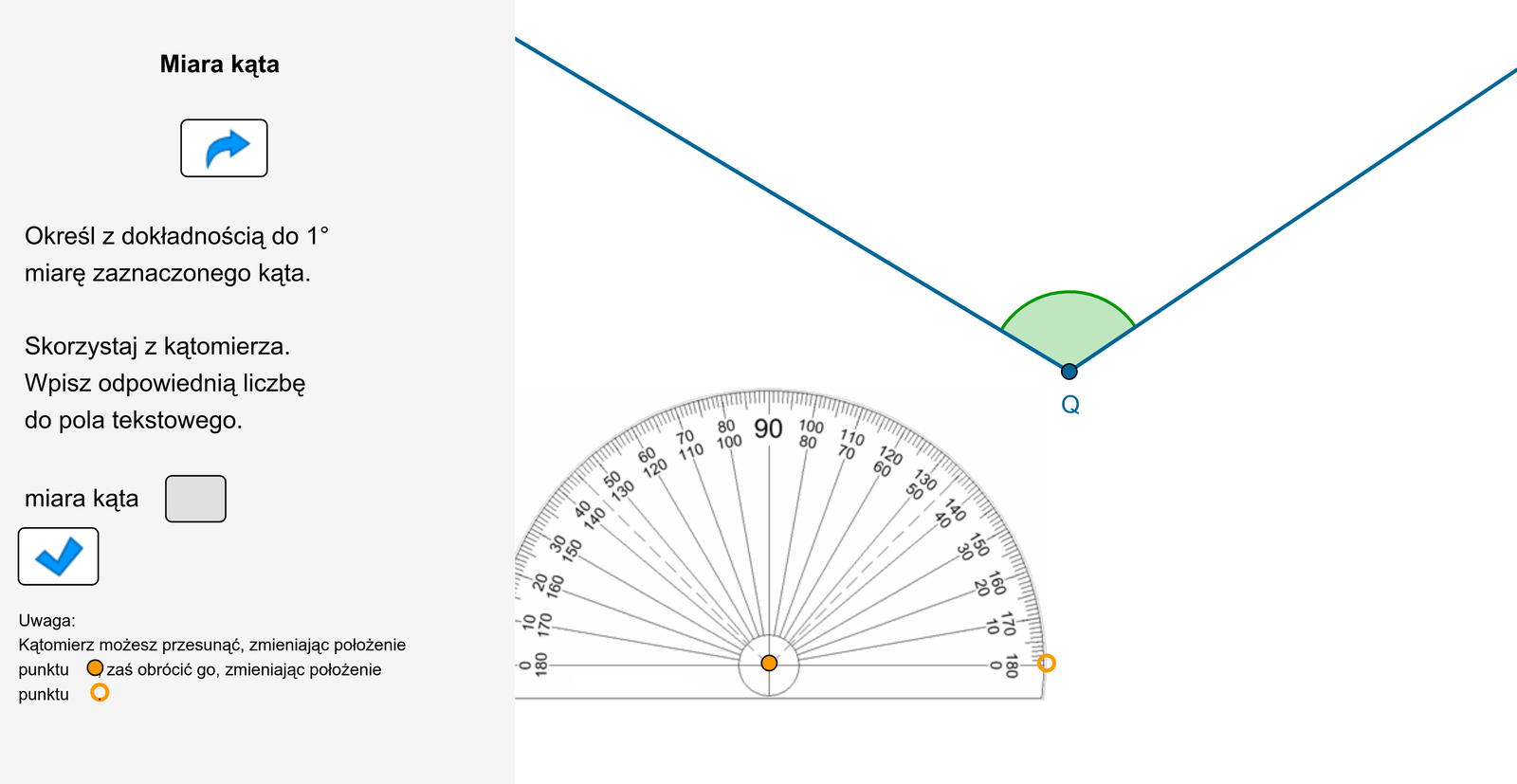 Animacja pokazuje kąt o wierzchołku w punkcie Q. Należy posługując się kątomierzem, dla różnych rodzajów kąta, określić jego miarę.