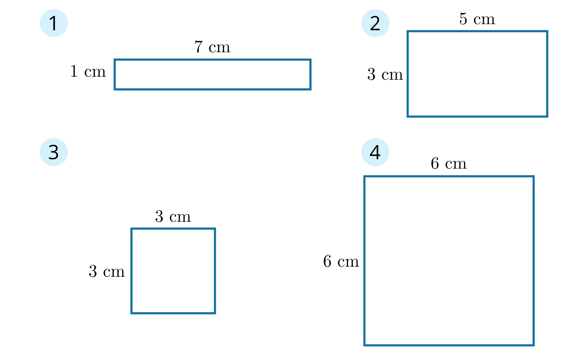 b) Prostokąt o polu 42 cm2 ma boki długości 7 cm i 1. 5 cm, 2. 16 cm, 3. 6 cm, 4. 9 cm.
