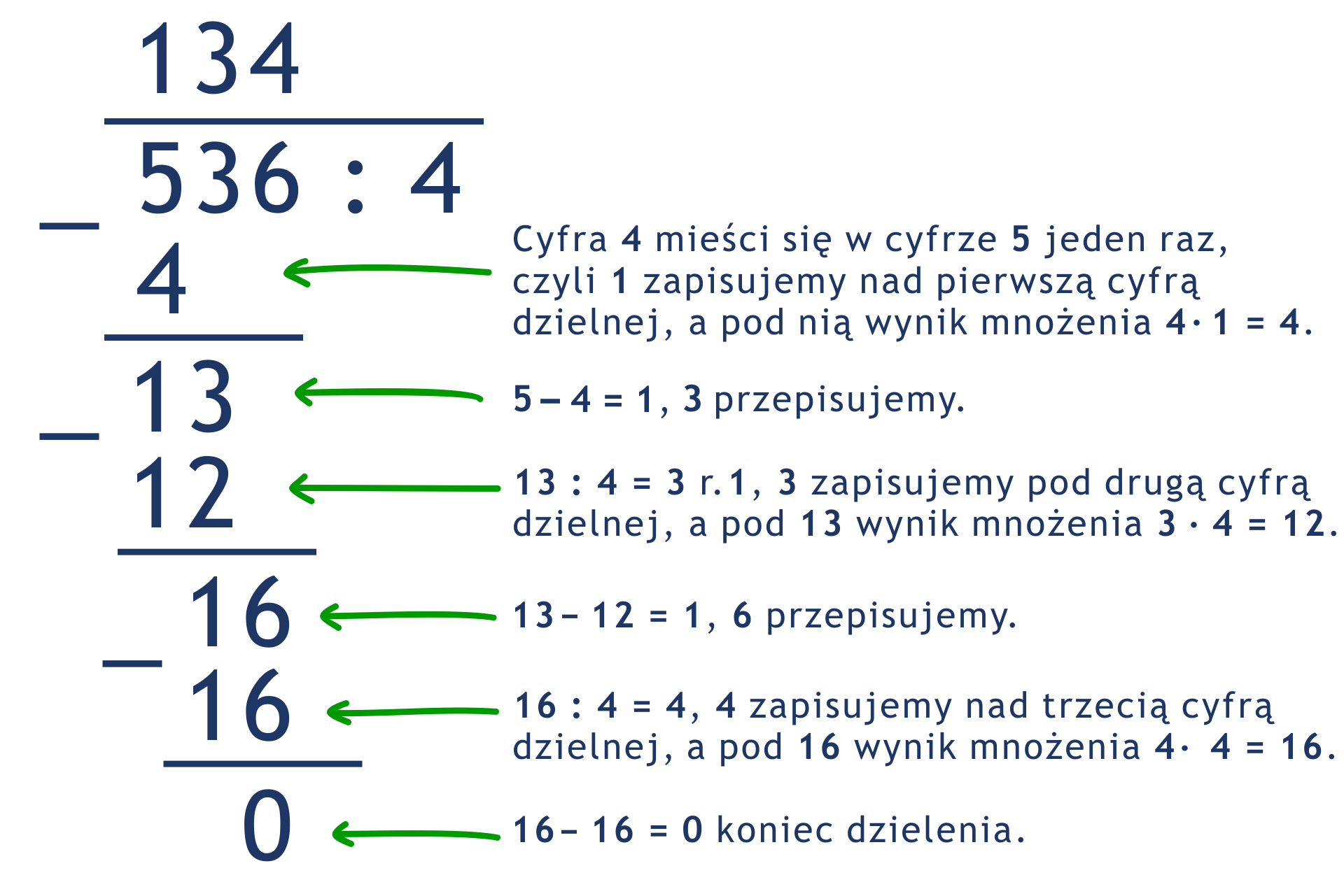 Mnożymy zapisaną nad kreską cyfrę przez dzielnik, czyli . Podkreślamy ten wynik kreską i wykonujemy odejmowanie. Pod kreską zapisujemy , ponieważ i tym samym kończymy dzielenie.