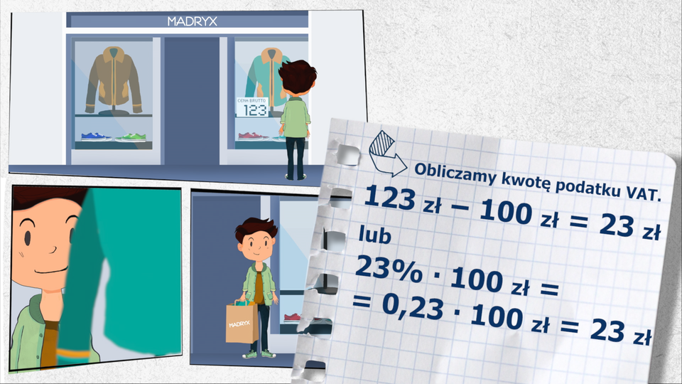 Animacja przedstawia w jaki sposób możemy obliczyć kwotę podatku VAT oraz cenę netto pewnych towarów, gdy dana jest cena brutto towarów.