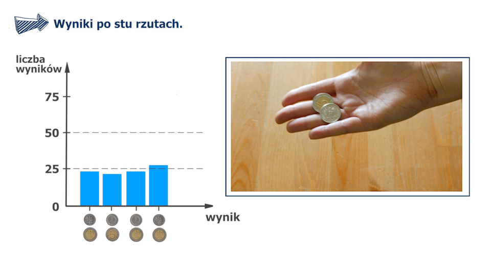 Animacja dotyczy rzutu dwoma różnymi monetami, na ekranie po lewej stronie wyświetla się wykres a po prawej okienko z animacją rzutu monetami.