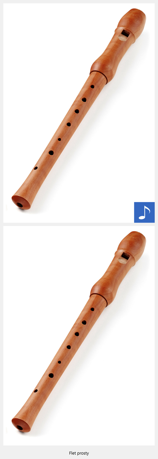 Ilustracja interaktywna przedstawia flet prosty. Na zdjęciu ukazany jest drewniany, podłużny instrument z ustnikiem i siedmioma otworami. Po naciśnięciu punktu aktywnego, wyświetla się napis: flet prosty i zostaje odtworzona próbka brzmienia. Flet brzmi miękko, miło dla ucha, delikatnie, słychać, że jego dźwięk pochodzi z drgającego powietrza.