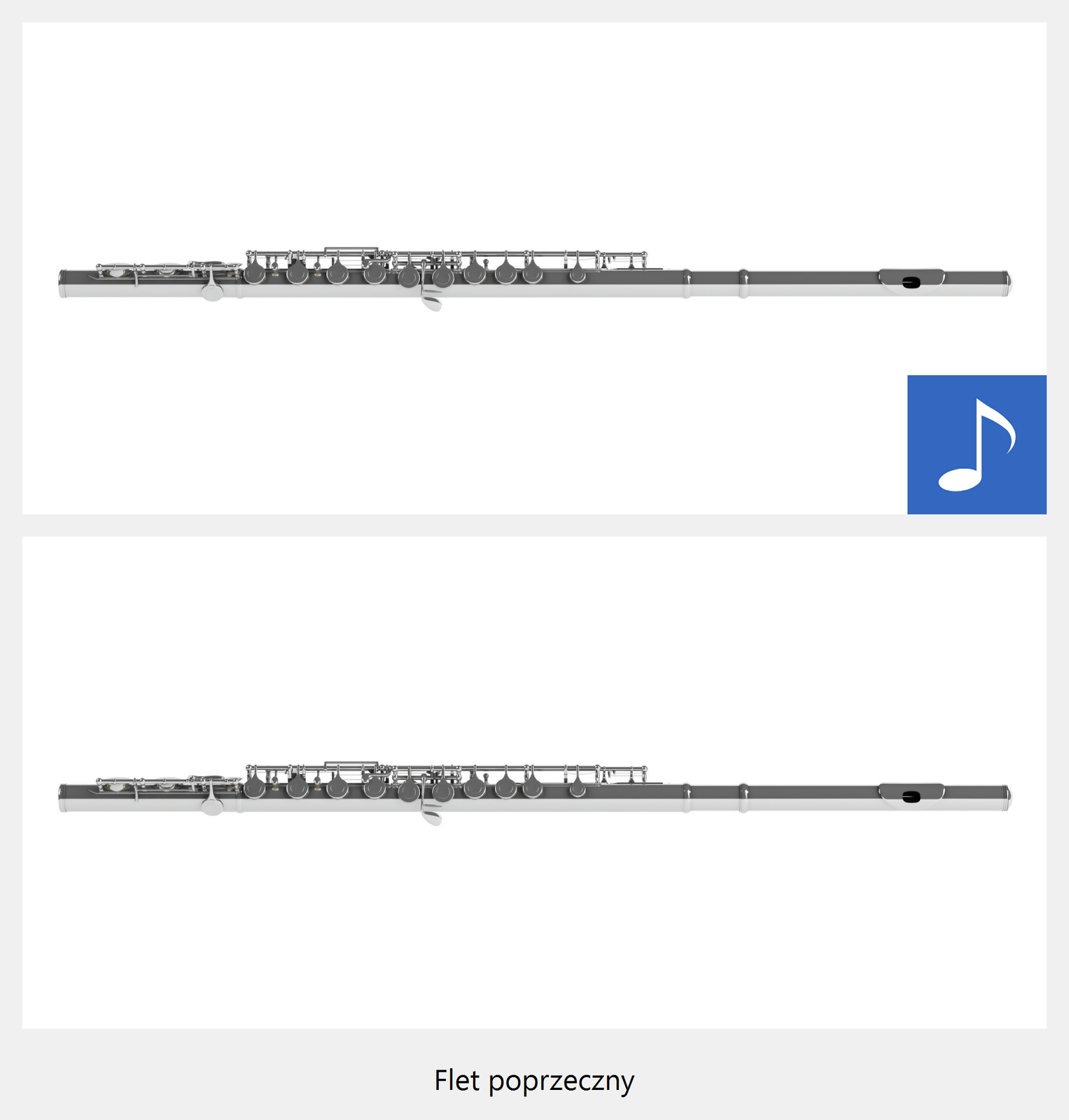 Ilustracja interaktywna przedstawia flet poprzeczny. Na zdjęciu ukazany jest metalowy, podłużny instrument z klapkami. Po naciśnięciu punktu aktywnego, wyświetla się napis flet poprzeczny i zostaje odtworzona próbka brzmienia. Flet brzmi miękko, miło dla ucha, delikatnie, ale mocniej niż flet prosty, słychać, że jego dźwięk pochodzi z drgającego powietrza. Przedstawione są dźwięki z całej skali fletu są one dość wysokie.