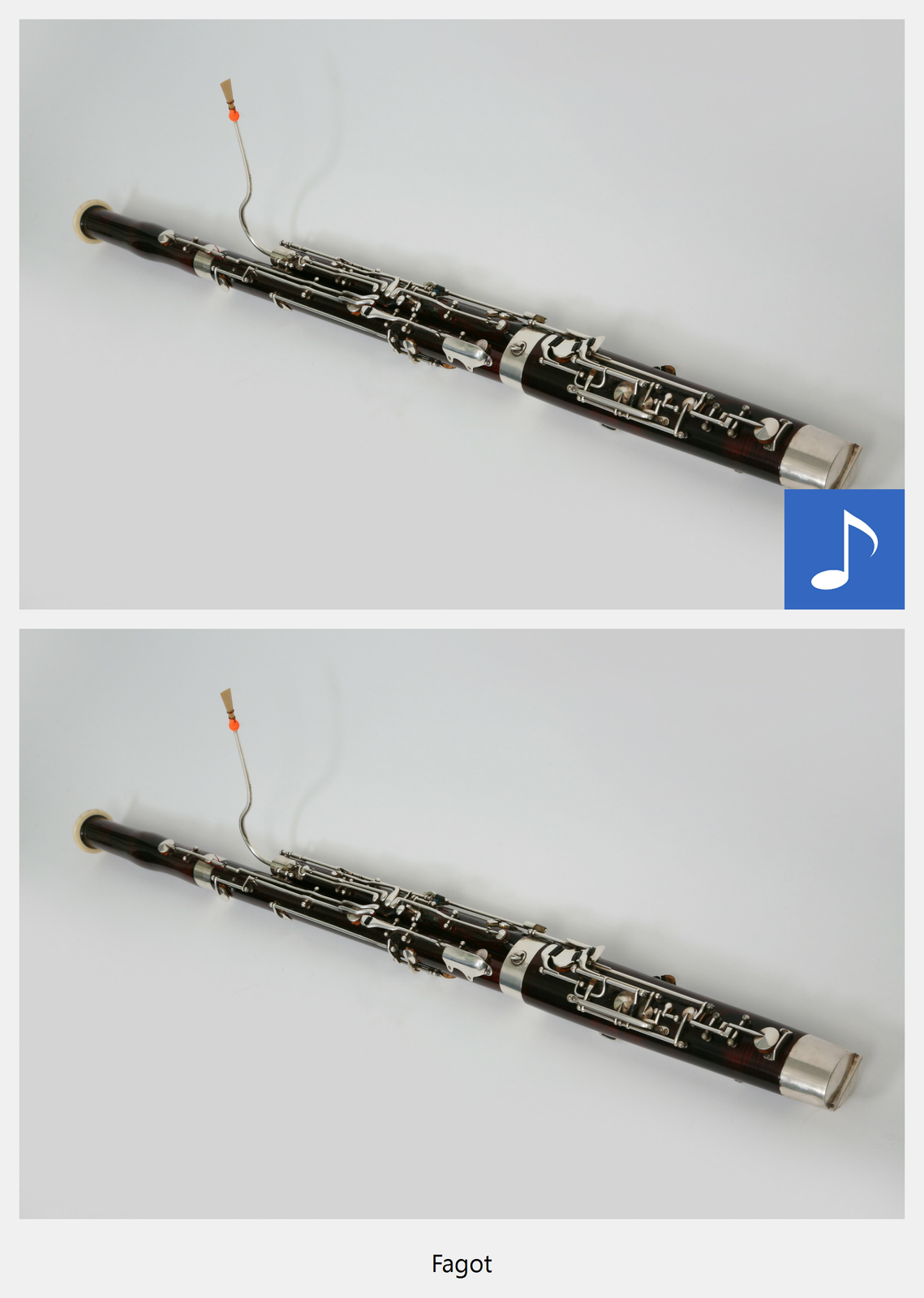 Ilustracja interaktywna przedstawia fagot. Na zdjęciu ukazany jest drewniany, podłużny instrument, złożony z dwóch połączonych w dolnej części rur oraz umieszczonego na wygiętej, w kształcie litery S, rurce ustnika. Po naciśnięciu punktu aktywnego, wyświetla się napis: fagot i zostaje odtworzona próbka brzmienia. Brzmienie instrumentu jest dość niskie, chropowate. Przedstawione są dźwięki z całej skali fagotu.