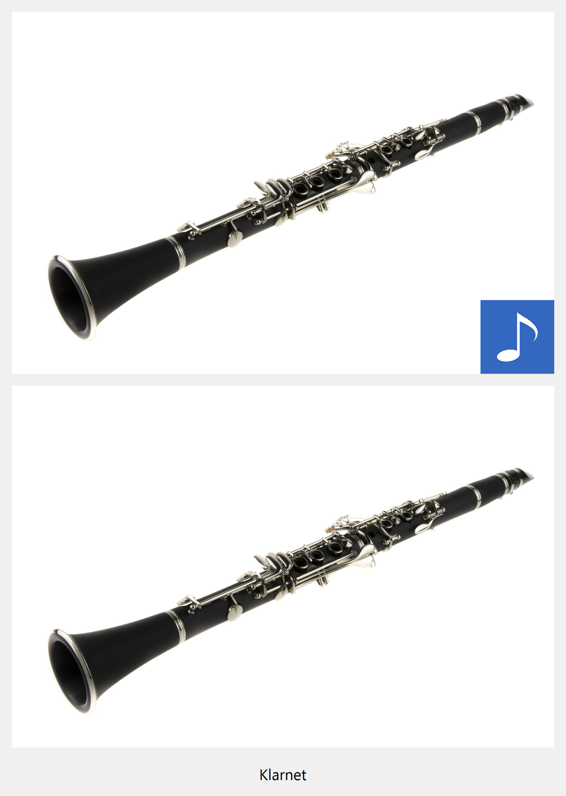 Ilustracja interaktywna przedstawia klarnet. Na zdjęciu ukazany jest czarny, podłużny instrument, rozszerzony na końcu z ustnikiem oraz metalowymi klapkami. Po naciśnięciu punktu aktywnego, wyświetla się napis: Klarnet i zostaje odtworzona próbka brzmienia. Brzmienie instrumentu jest dość jasne, trochę skrzeczące.