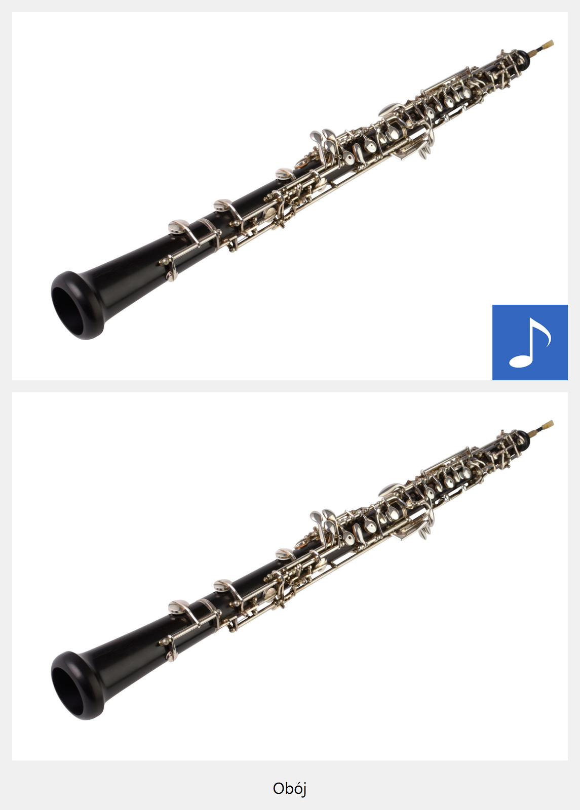 Ilustracja interaktywna przedstawia obój. Na zdjęciu ukazany jest drewniany, podłużny instrument z metalowymi klapkami oraz cienkim, spłaszczonym ustnikiem. Po naciśnięciu punktu aktywnego, wyświetla się napis: Obój i zostaje odtworzona próbka brzmienia. Brzmienie instrumentu jest trochę jaśniejsze niż brzmienie rożka angielskiego, przenikliwe, trochę brzęczące.