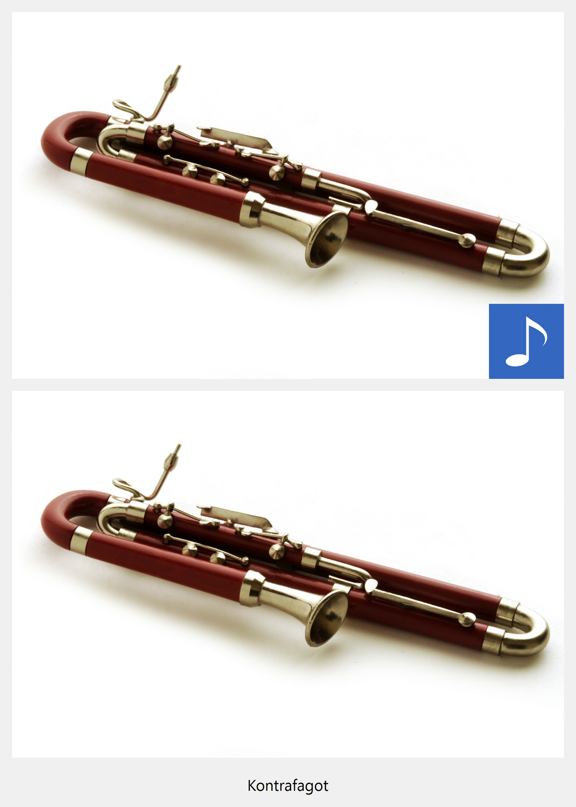 Ilustracja interaktywna przedstawia kontrafagot. Na zdjęciu ukazany jest drewniany, podłużny instrument składający się z poczwórnie złożonej rury z metalowymi klapkami i ustnikiem umieszczonym na wygiętej rurce. Po naciśnięciu punktu aktywnego, wyświetla się napis kontrafagot i zostaje odtworzona próbka brzmienia. Brzmienie instrumentu jest bardzo niskie, chropowate. Najniższe dźwięki mocno wibrują.