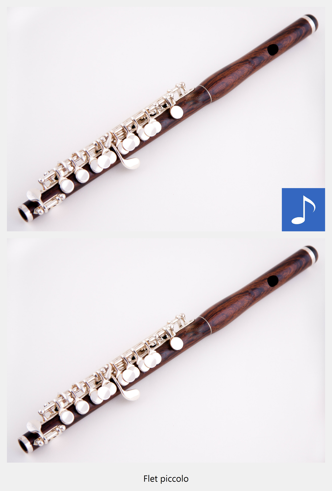 Ilustracja interaktywna przedstawia flet piccolo. Na zdjęciu ukazany jest drewniany, podłużny instrument z metalowymi klapkami. Po naciśnięciu punktu aktywnego, wyświetla się napis flet piccolo i zostaje odtworzona próbka brzmienia. Flet piccolo brzmi bardzo jasno, trochę piskliwie, niektóre dźwięki są bardzo wysokie.