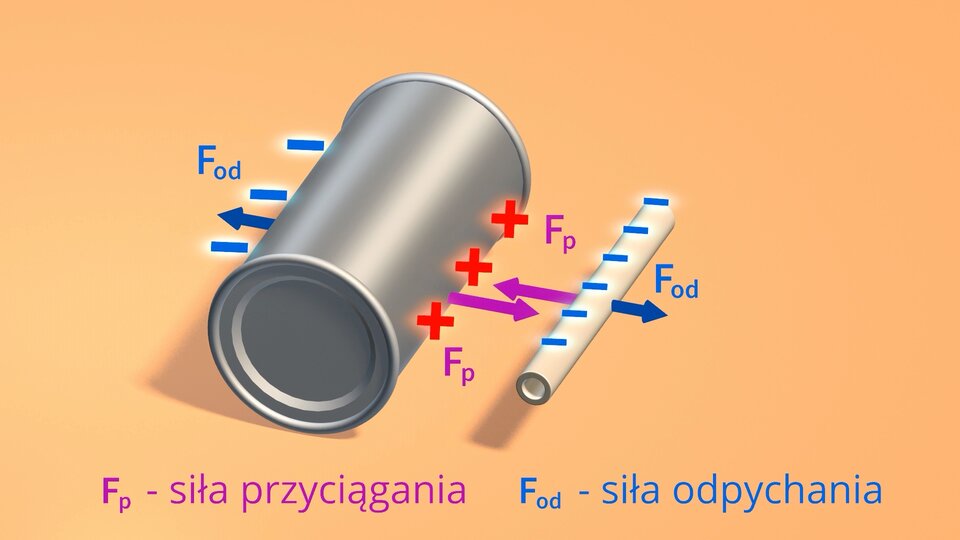 Puszka się nie porusza, gdy zbliżamy do niej rurkę obojętną elektrycznie. Zakładamy, że w wyniku potarcia rurka elektryzuje się ujemnie. Zbliżenie jej do metalowej puszki wykonanej z materiału będącego dobrym przewodnikiem wywołuje przemieszczenie się elektronów swobodnych – przeważającym ładunkiem (od strony rurki) staje się ładunek dodatni. Działają wówczas dwie siły, tj. przyciągania i odpychania elektrostatycznego. Siła przyciągania występuje między ładunkami dodatnimi (gromadzącymi się powierzchni puszki od tej strony, z której do puszki zbliżona została ujemnie naładowana rurka) a ładunkiem naelektryzowanej rurki. Siła odpychania działa między elektronami swobodnymi zgromadzonymi z przeciwnej strony puszki a ujemnym ładunkiem rurki. Pamiętajmy, że siły oddziaływania elektrostatycznego są zależne od odległości między ciałami – im bliżej siebie znajdują się wzajemnie oddziałujące ciała, tym siła tych oddziaływań jest większa. W tym przypadku siła przyciągania, która jest efektem oddziaływania rurki z bliższą stroną puszki (tą, na której zebrały się ładunki dodatnie) ma więc większą wartość, niż siła odpychania, która jest efektem oddziaływania rurki z dalszą stroną puszki (tą, na której zebrały się ładunki ujemne). Ruchowi rurki towarzyszy ruch podążającej za nią puszki. Gdy oddalimy naelektryzowaną rurkę na odpowiednią odległość, elektrony swobodne na puszce wrócą na swoje właściwe miejsce (tj. do położenia początkowego) i ruch puszki ustanie.