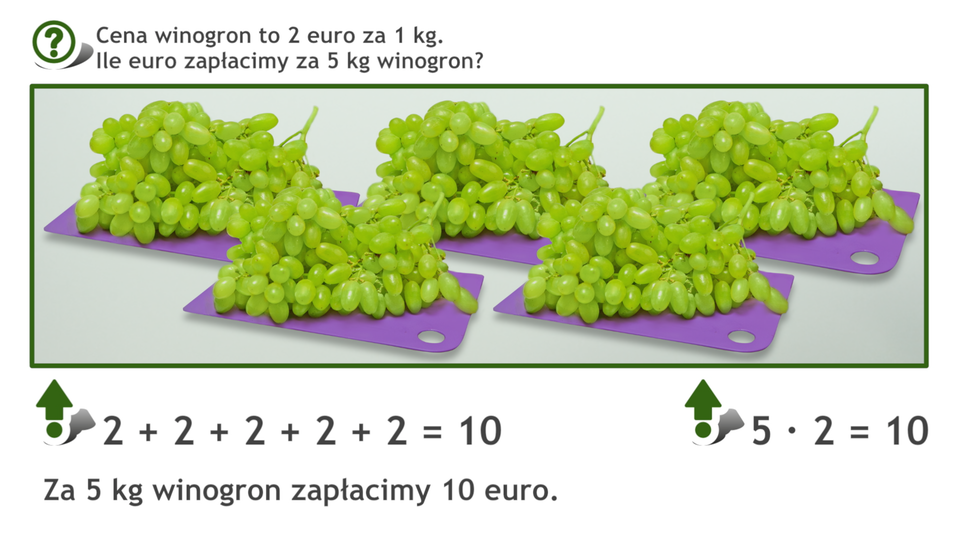 Animacja przedstawia jak przy pomocy mnożenia obliczyć cenę kilku kilogramów produktu, jeżeli znamy cenę jednego kilograma.