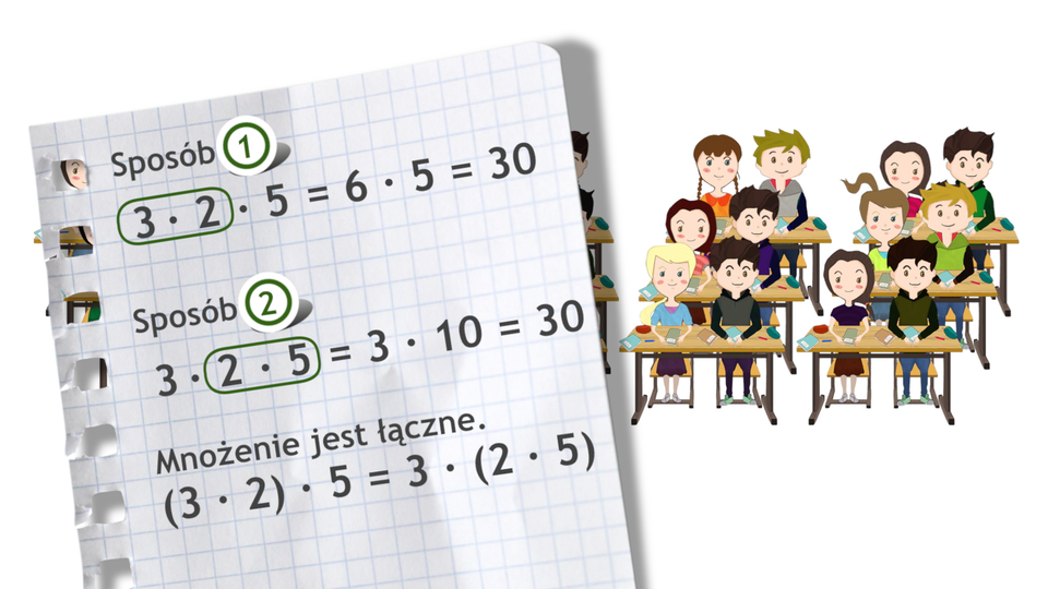 Wykonując mnożenie kilku liczb, można dowolnie łączyć dwa sąsiadujące czynniki, a iloczyn nie ulegnie zmianie. Mówimy, że mnożenie jest łączne.
